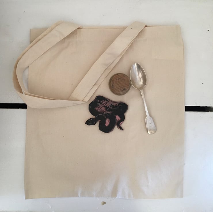 A large natural organic cotton tote bag printed in my Adder print. These bags will be printed to order by hand in my studio using black ink.