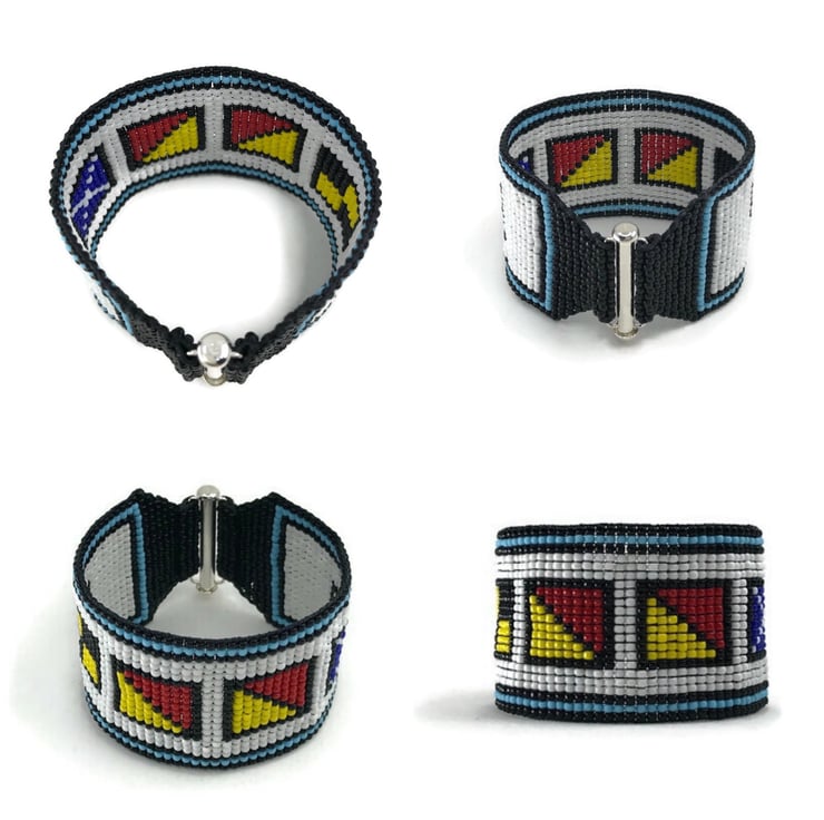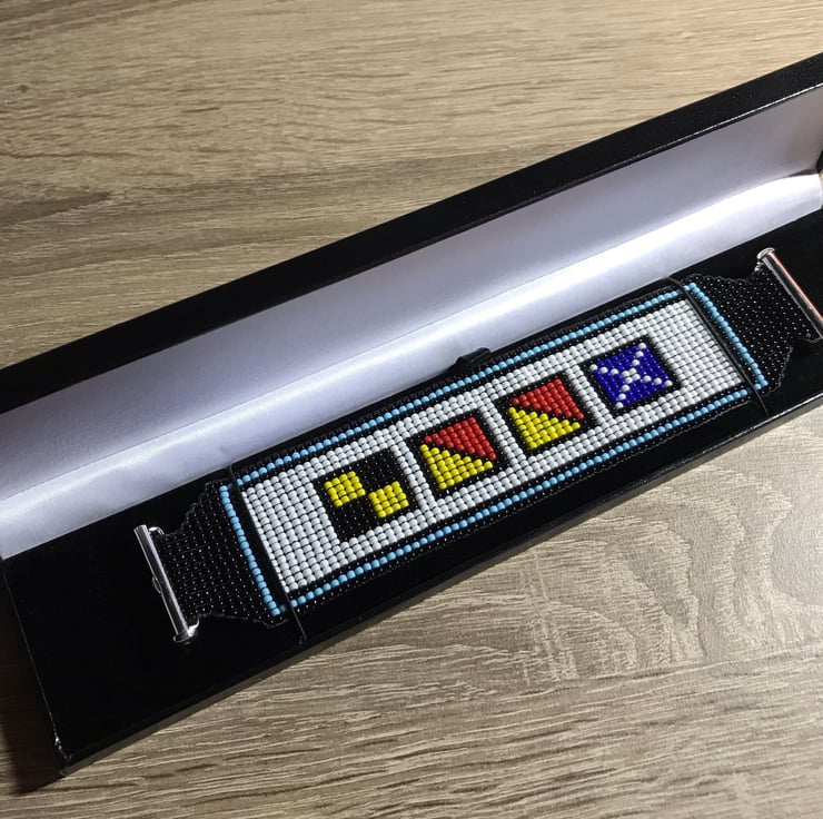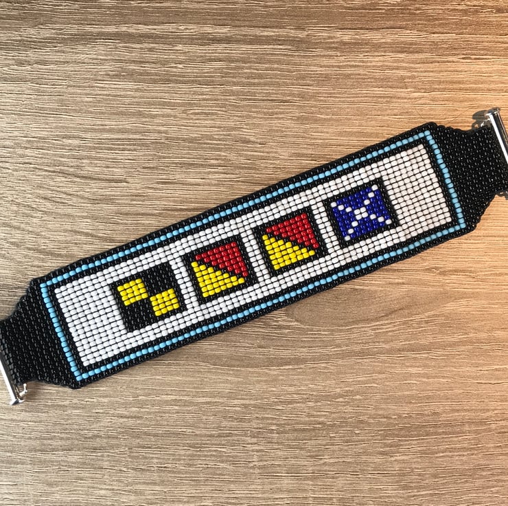 Perfect for summer, this stunning bead woven cuff spells ‘LOOM' in maritime signal flags.