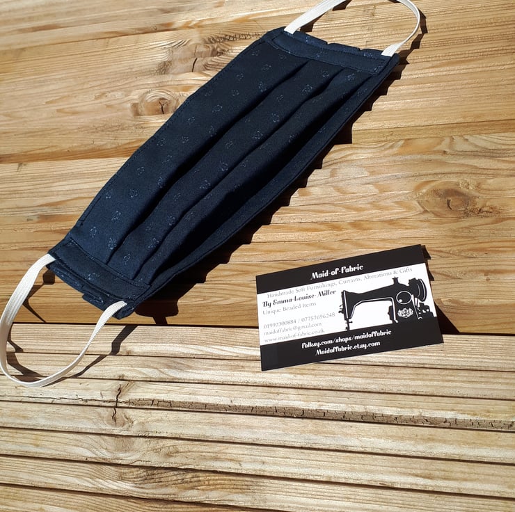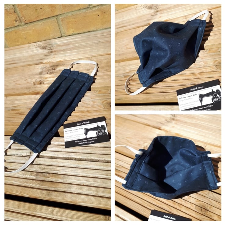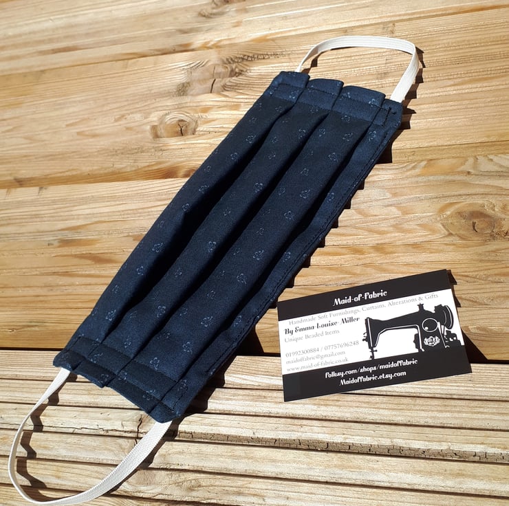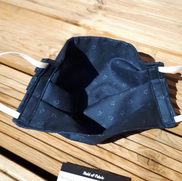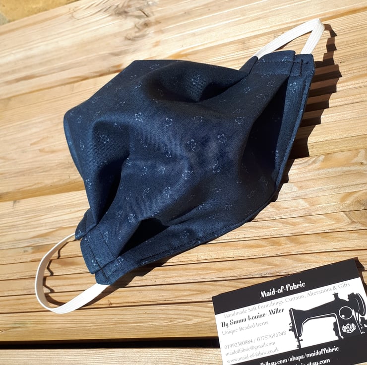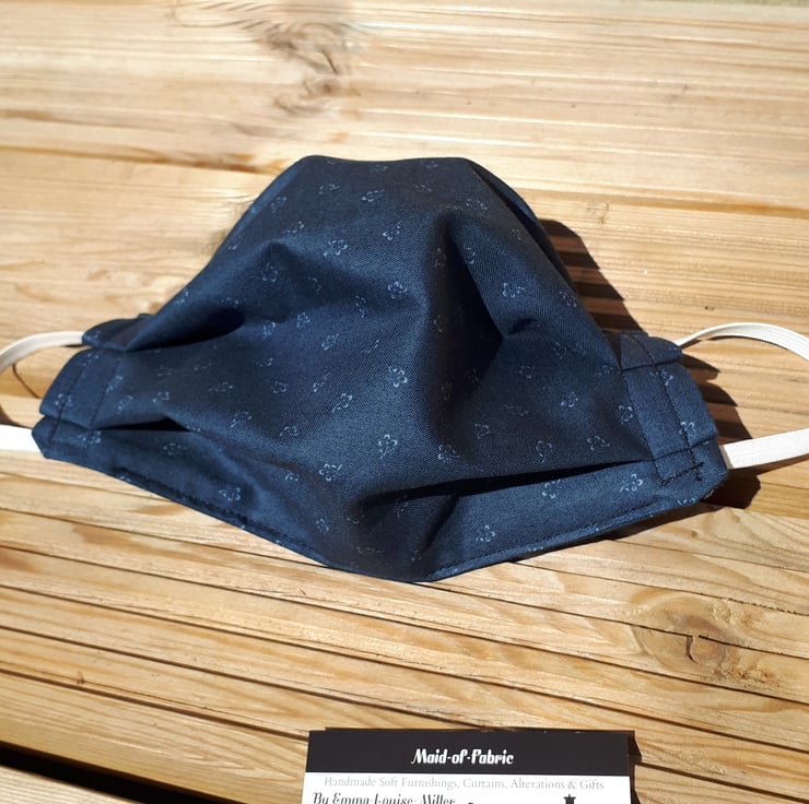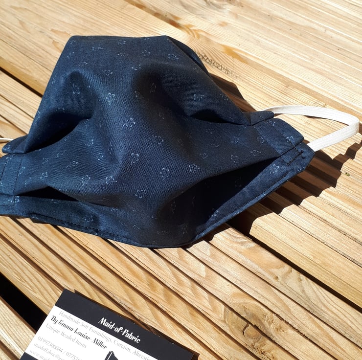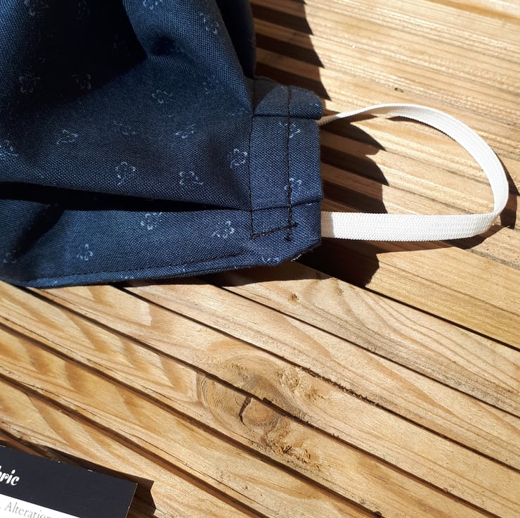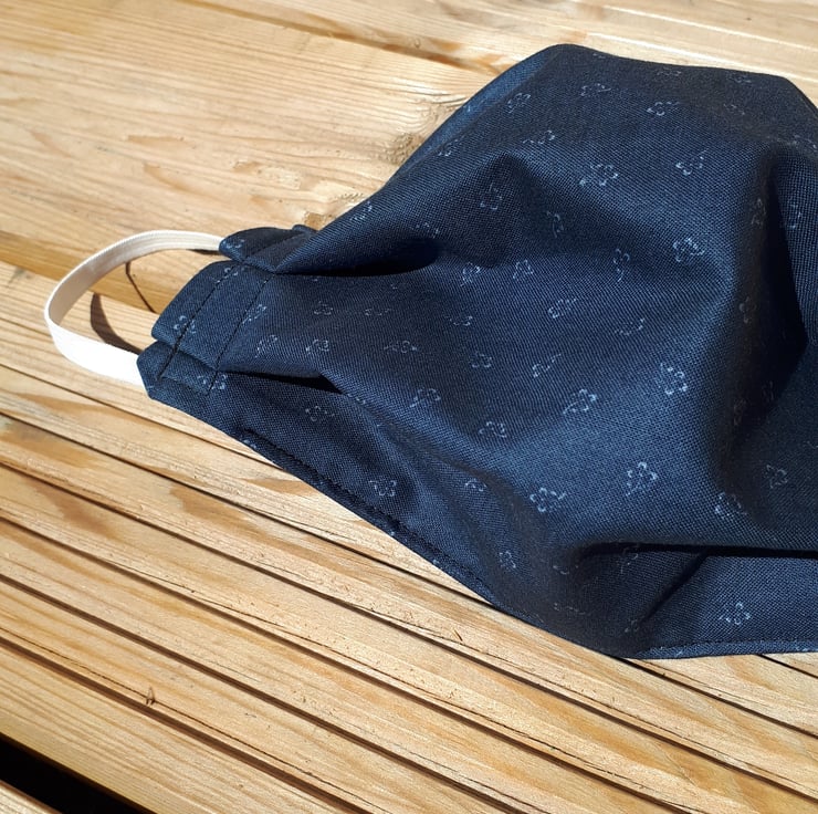 Face mask made using a dark grey flower cotton fabric and white elastic.