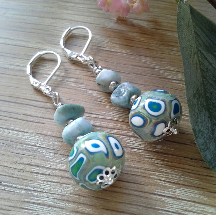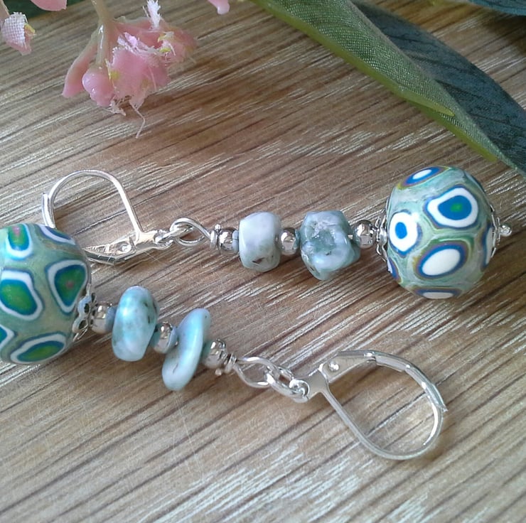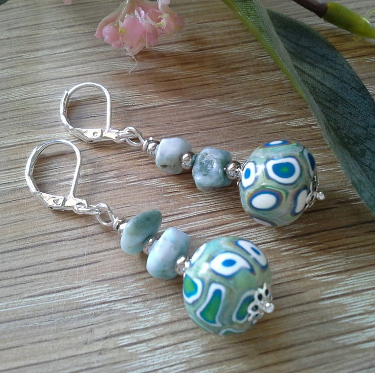 A very pretty eye catching pair of earrings designed and lovingly hand crafted by myself. The clay beads are made from my own polymer clay canes, baked, hand sanded and then varnished using a professional clay varnish. To compliment them I have incorporated genuine rare larimar gemstone nuggets.