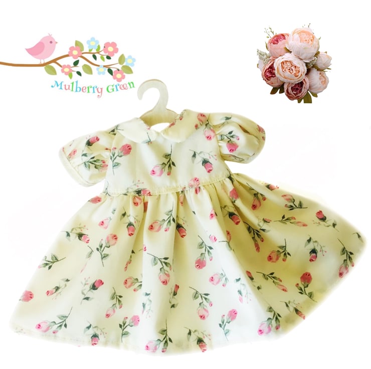 A beautiful cream dress, covered in pretty pink rosebuds, to fit the Mulberry Green characters. The dress has a full skirt, puffed sleeves and a Peter Pan collar and comes on a cute little wooden hanger. It matches the rosebud cardigan.