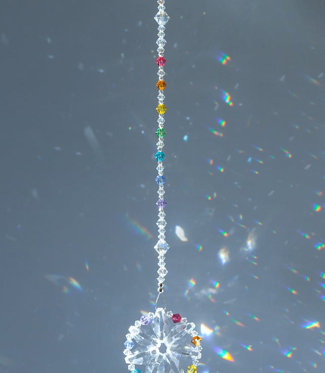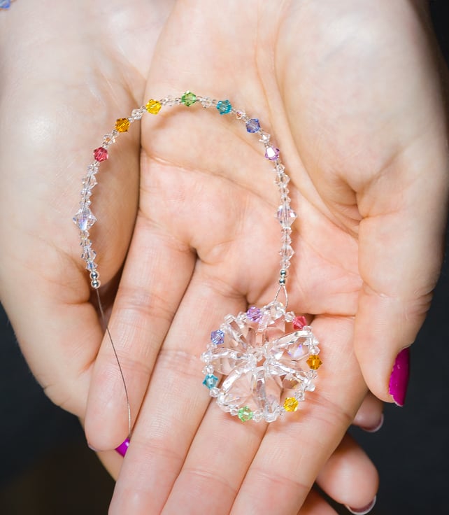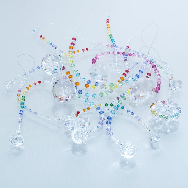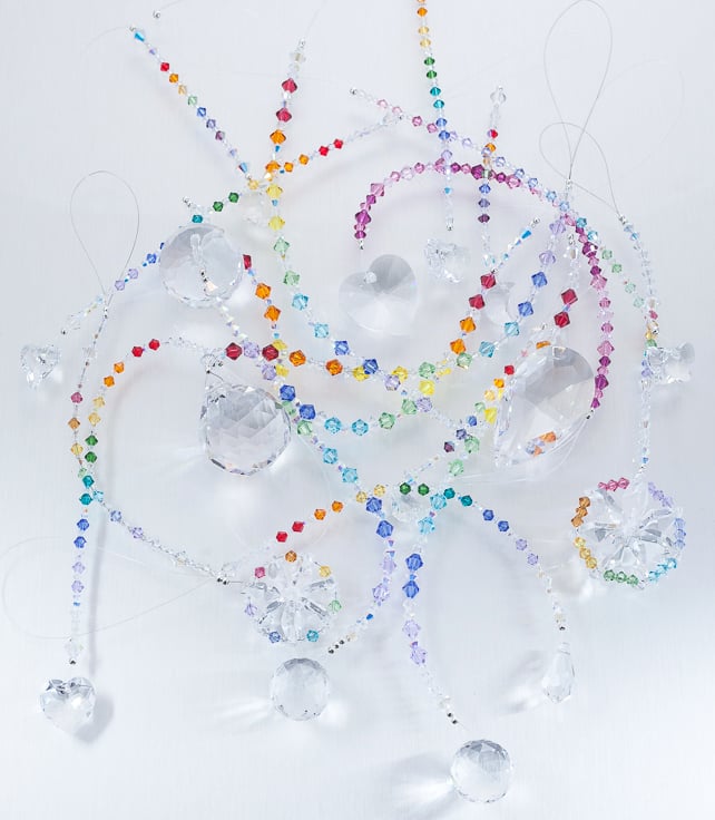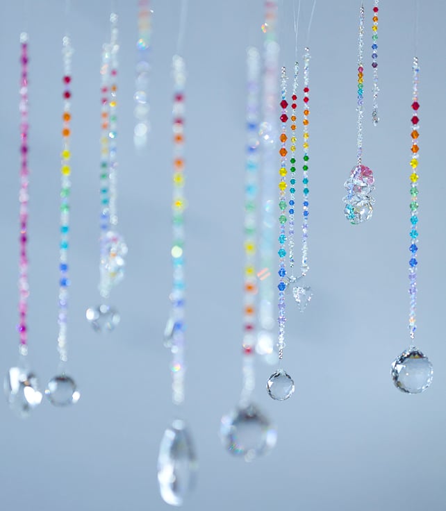Our Swarovski bracelets are so sparkly that we wondered what else we could make. I love sun catchers and wind chimes, and rainbows are so happy and colourful. It seemed like a perfect match.