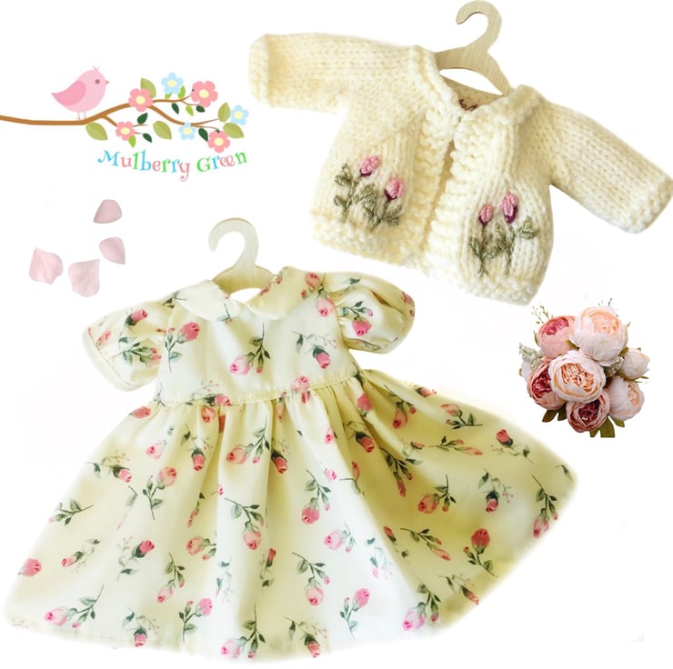 A beautiful cream cardigan, embroidered with pretty pink rosebuds, to fit the Mulberry Green characters. The cardigan is hand knitted and comes on a cute little wooden hanger. It matches the rosebud dress.