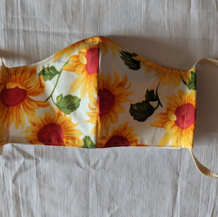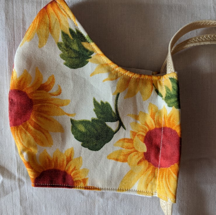 This is a face covering with elastic ties. It is is made of 100% cotton with a design of sunflowers on a white background.