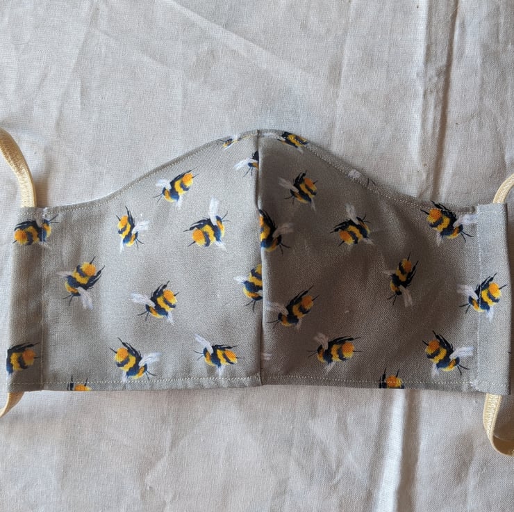 This is a face covering with elastic ties. It is is made of 100% cotton with a design of bees on a grey background.