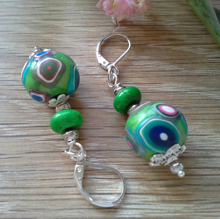 A fabulous eye catching pair of earrings designed and hand crafted by myself. I have used dyed green genuine magnasite gemstones with my own hand made polymer clay beads. The beads have been hand crafted using my own design clay canes, baked, hand sanded and varnished using specialist clay varnish to seal the beads and maintain their vibrant colour.