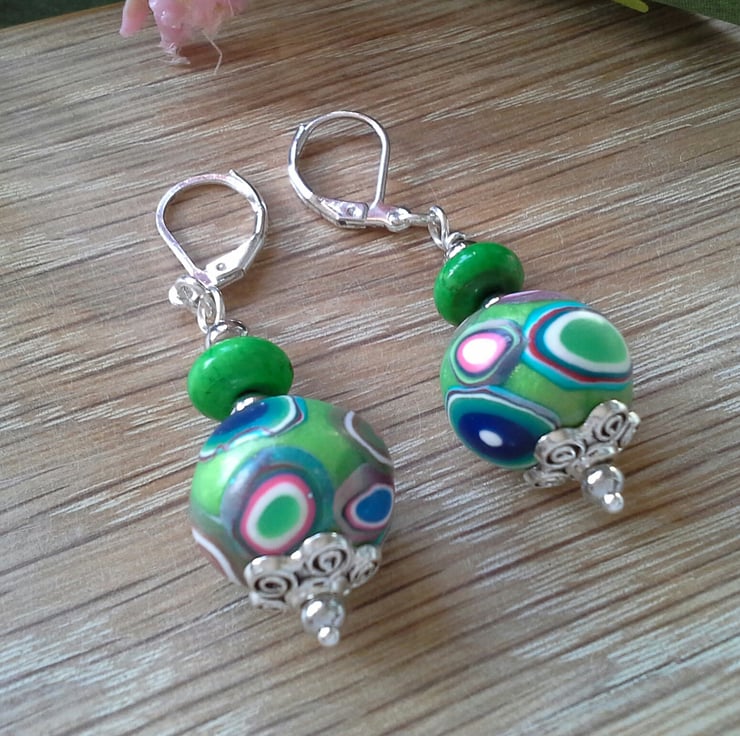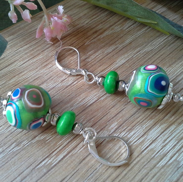 A fabulous eye catching pair of earrings designed and hand crafted by myself. I have used dyed green genuine magnasite gemstones with my own hand made polymer clay beads. The beads have been hand crafted using my own design clay canes, baked, hand sanded and varnished using specialist clay varnish to seal the beads and maintain their vibrant colour.
