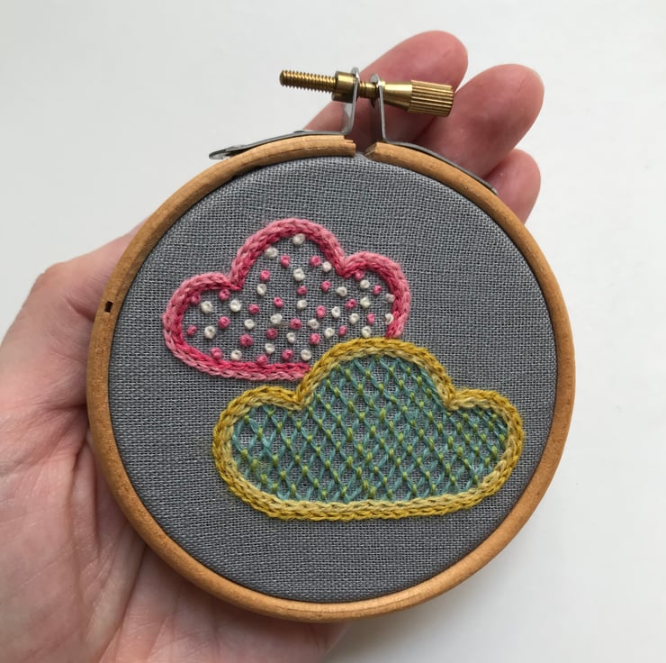 Traditional crewel embroidery techniques are used to outline and fill the cloud shapes, using chain stitch, laid trellis work and french knots, in Appleton Crewel Wool. Each of my embroidery pieces is completely hand embroidered and unique.