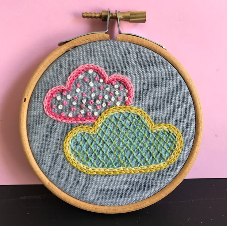 Drifting on a grey linen background are two hand embroidered clouds, in soothing shades of pink, yellow and mint.