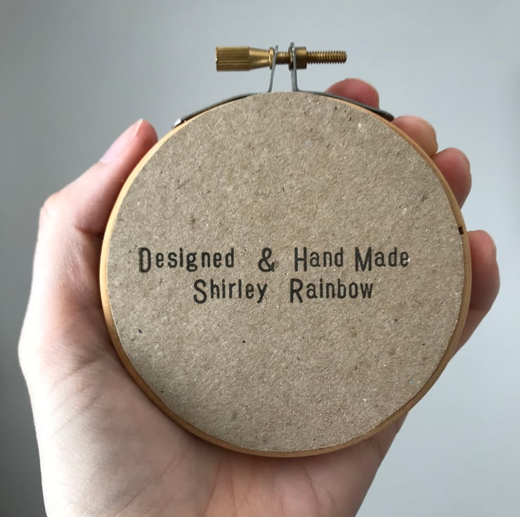 The embroidery hoop measures 3’’ / 8cm wide. It can be hung on the wall using the tightening screw at the top or propped on a shelf along with other treasures. The back of the hoop is covered with a card disc.