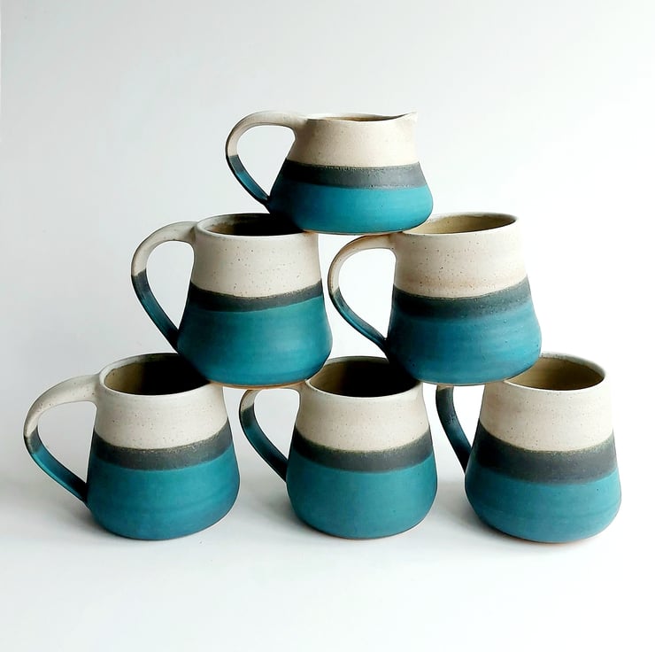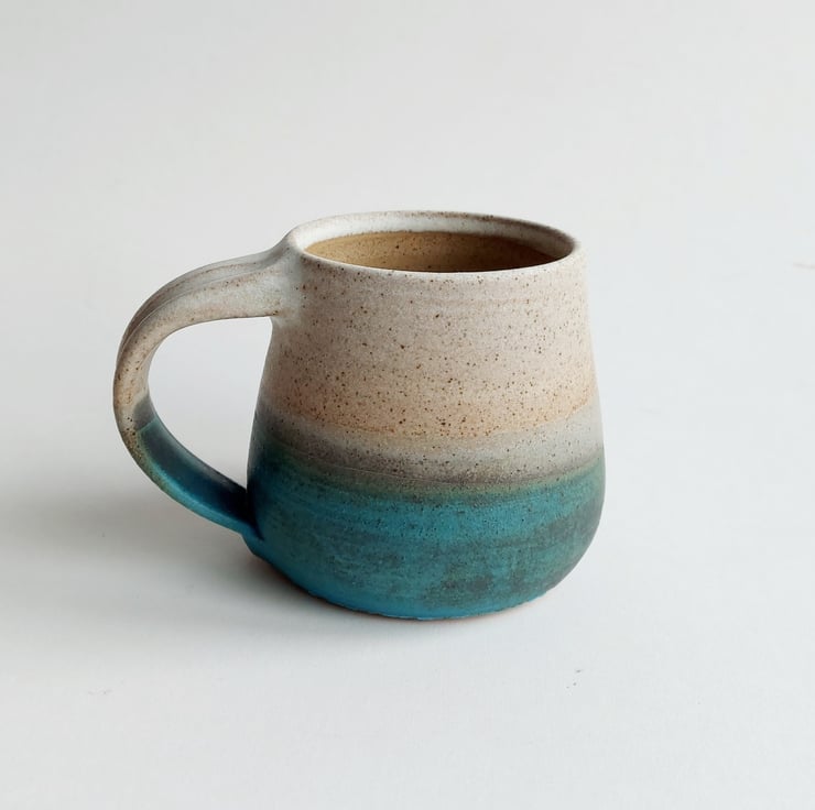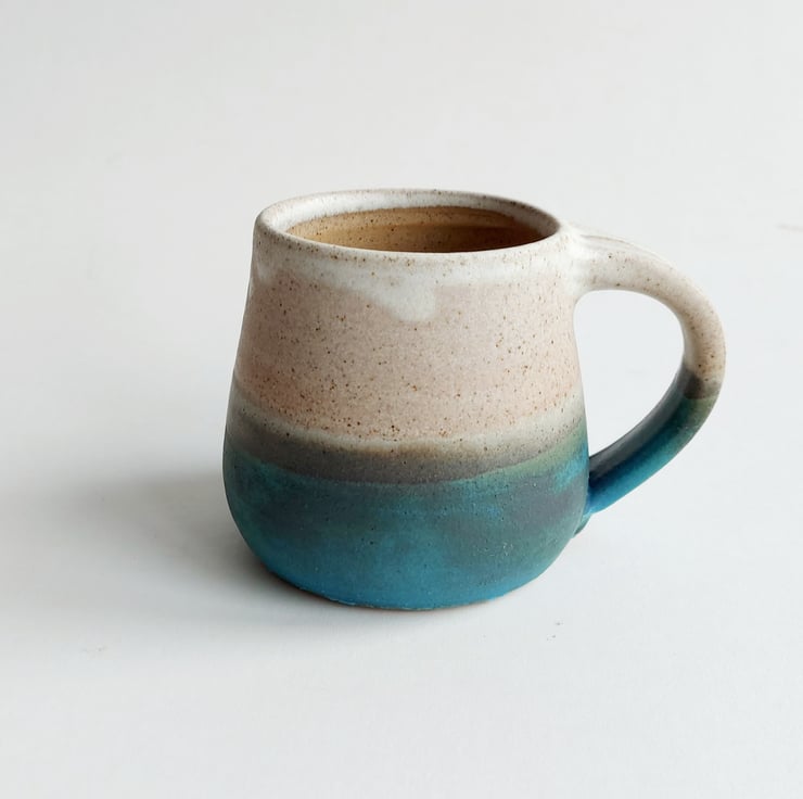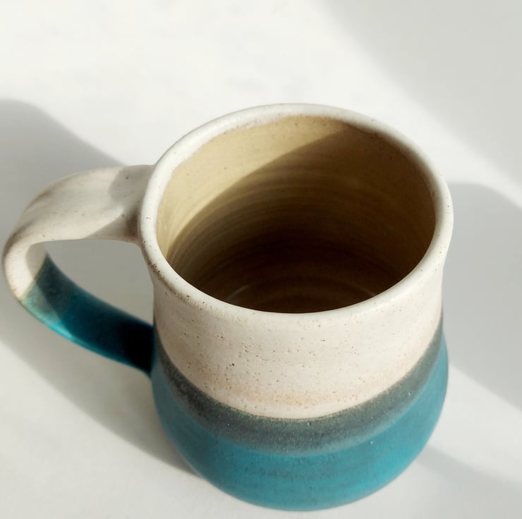 It is bisque fired then 3 lead-free glazes are applied. Clear gloss inside and then a mat creamy glaze and a turquoise blue. Where these glazes meet they interact to make a sea green colour. There is added texture in this layer and even bubbles. The mugs are then fired again to 1220 oC.