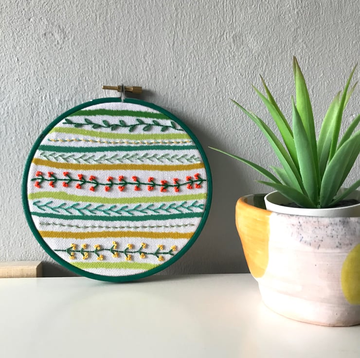 The embroidery is framed in a wooded embroidery hoop which has been painted with green acrylic paint. The hoop measures 13.5cm / 5” wide. It can be displayed by hanging on the wall, or propped on a shelf. The printed fabric is 100% linen. The back of the hoop is covered with card.