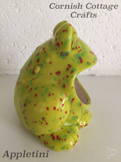 The frog is painted in a crystal glaze and has been fired in my kiln. It is dishwasher safe.