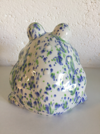 The frog is painted in a crystal glaze and has been fired in my kiln. It is dishwasher safe.
