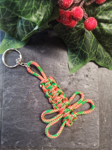 Colourful Orange and green macrame dragon fly. Made by hand using 3mm paracord and attached to a keyring. Can also be used as a tree decoration or bag charm.