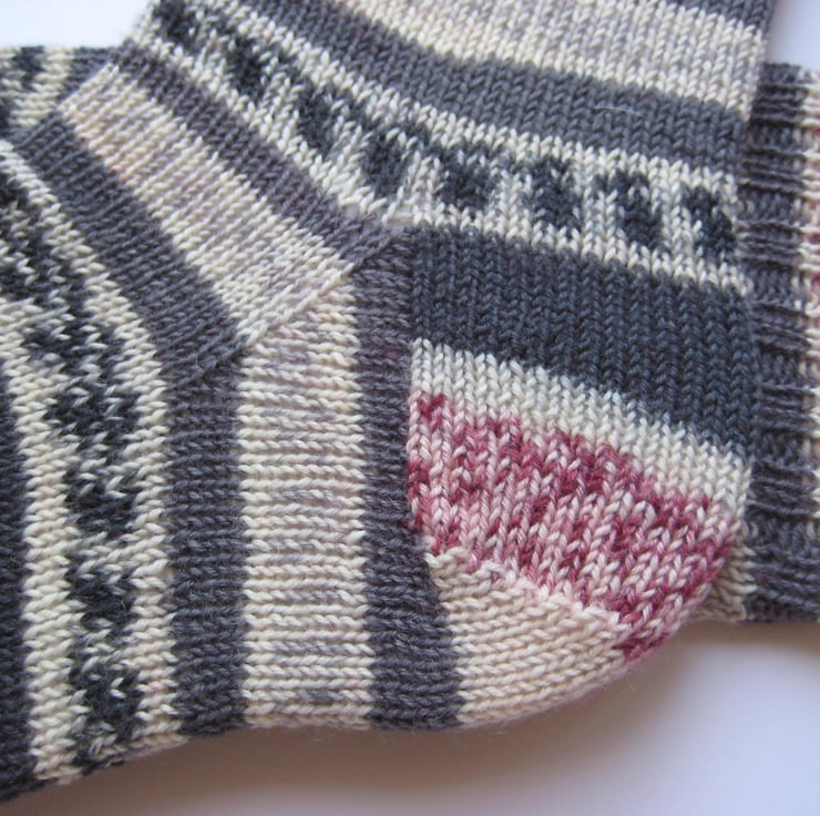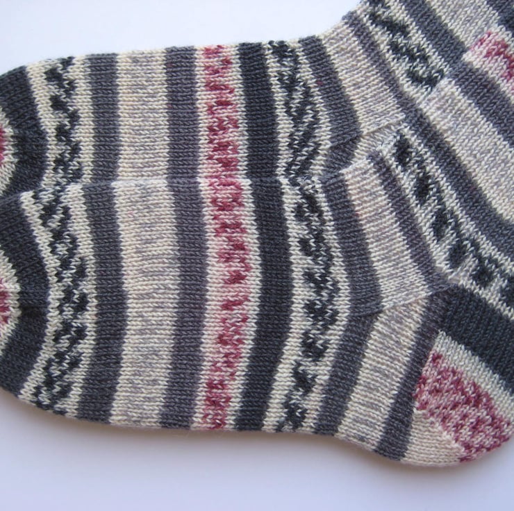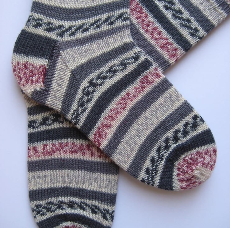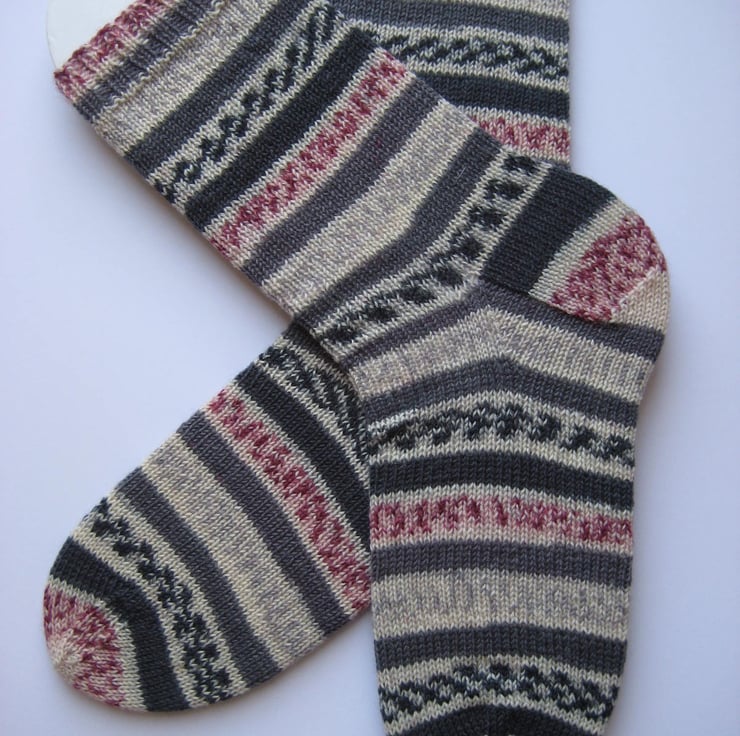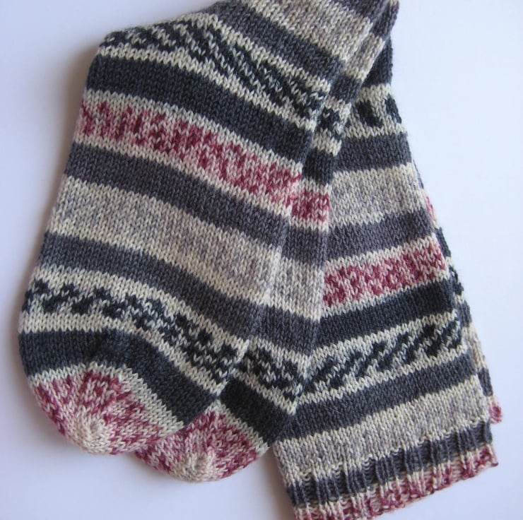 Hand knitted in the round on 5 double pointed needles, these wool socks are made from Trekking 4 ply self patterning sock yarn (75% wool 25% polyamide) in shades of grey and crimson. Made from very fine yarn, they are not thick and will fit most footwear. Warm and durable, these socks will keep your feet comfortable and bright throughout the year.