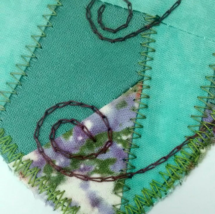 Individually sewn patchwork and embroidered heart shape created from the smallest cotton fabric scraps. Mounted onto recycled cardstock to create a romantic greetings card or small piece of textile art. Ideal for anniversaries, particularly a second wedding anniversary (cotton).