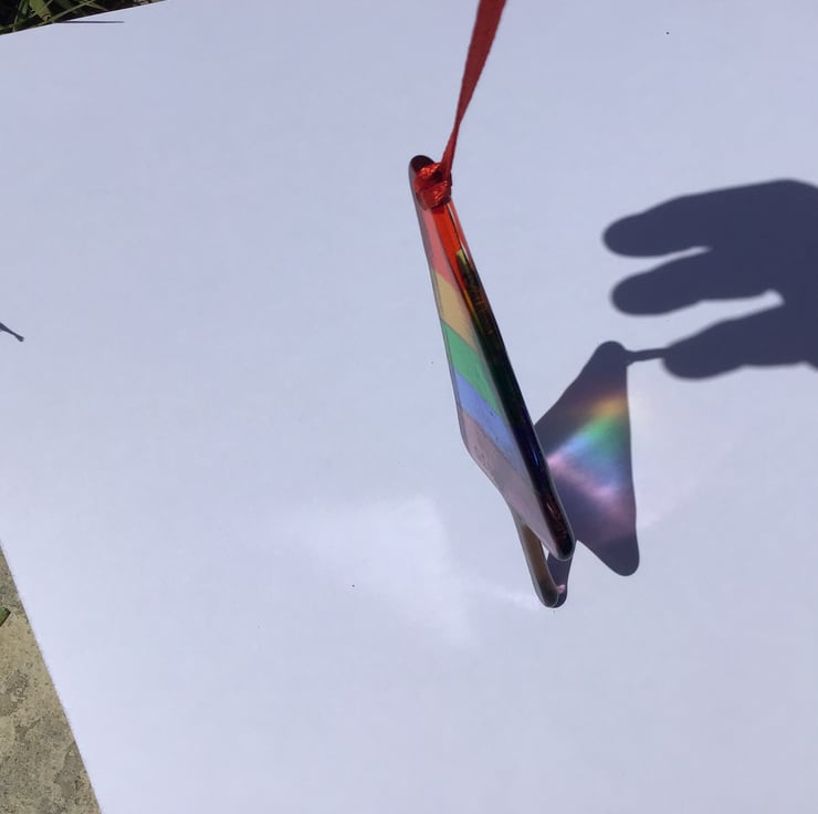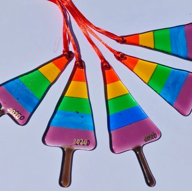 Fused glass rainbow 2020 Christmas trees . As a way of symbolising the hope we have that we will get through the pandemic of 2020 . A lovely bright rainbow tree that will cast beautiful reflections . A special symbol of hope . Approximately 6 inch x 2.5 inch with gold mica paint 2020 on it .
