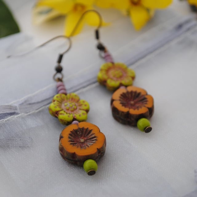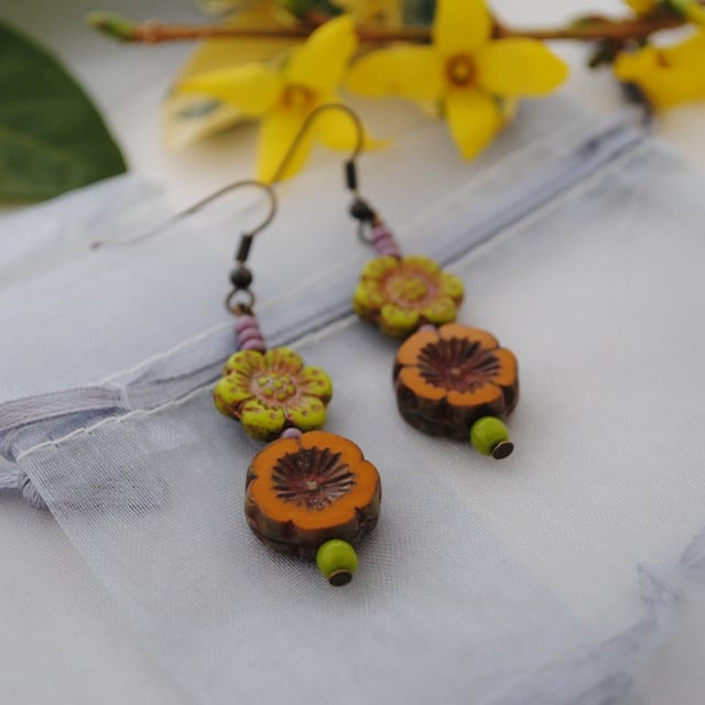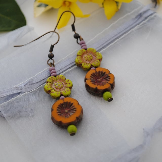 These earrings are made with antique brass wires and feature orange peony flower with a chartreuse green flower bead and toning mauve seed beads.