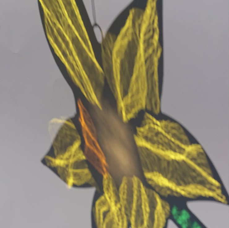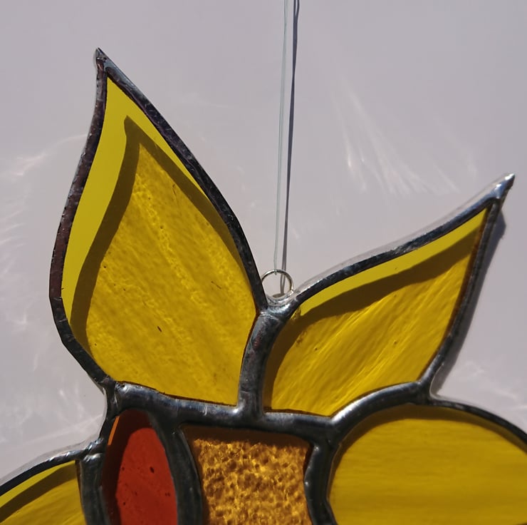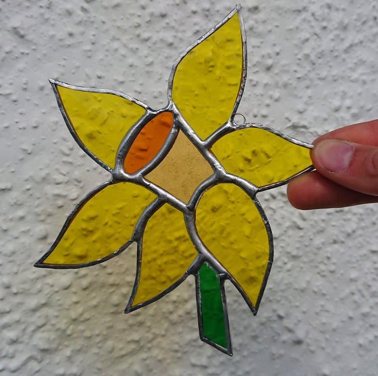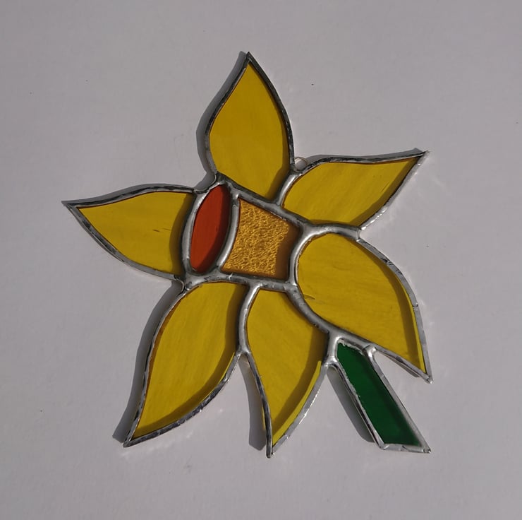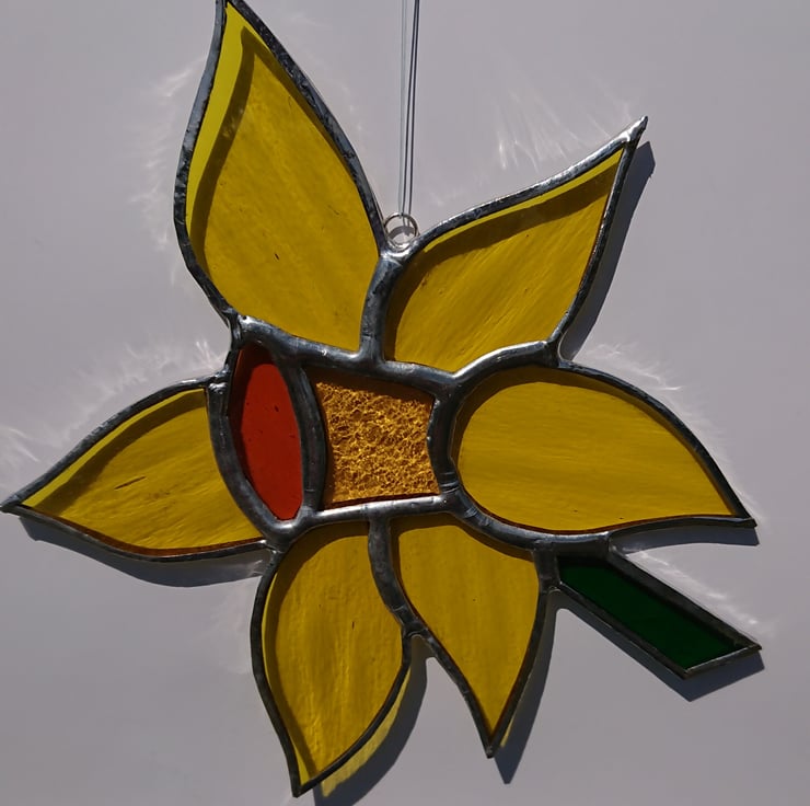 This is cut from a beautiful strong yellow water glass for the petals with two amber tones for the trumpet. A vibrant green stalk completes the piece.