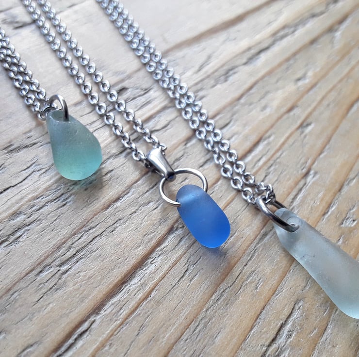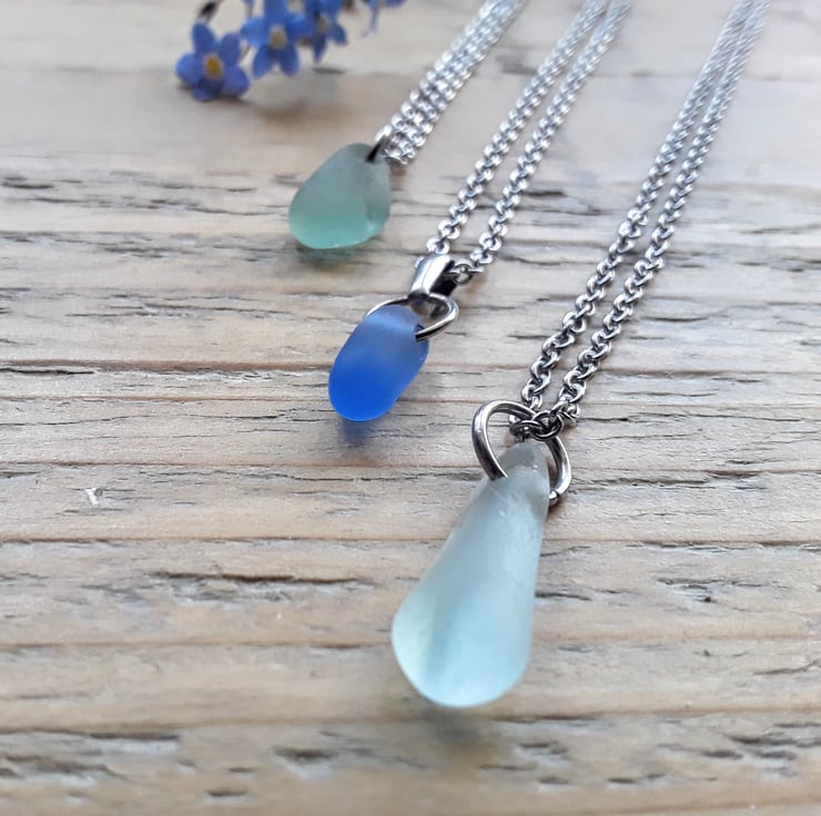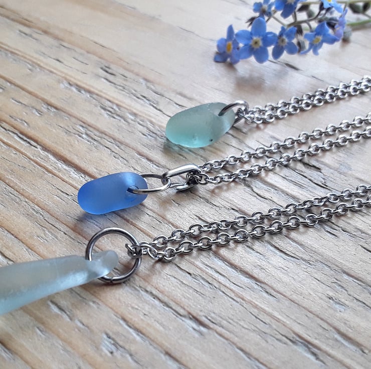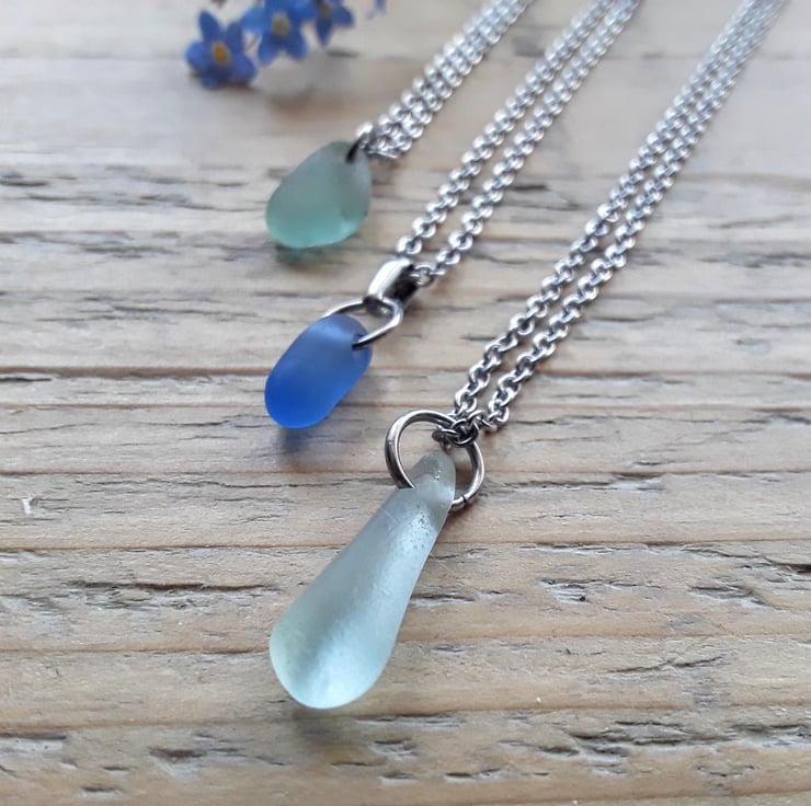 2. SOLD! A small but perfectly formed piece of forget-me-not blue seaglass collected from Porthcawl in Wales. It hangs at 2cm long from the chain. The seaglass itself is 1cm long and 0.5cm wide.