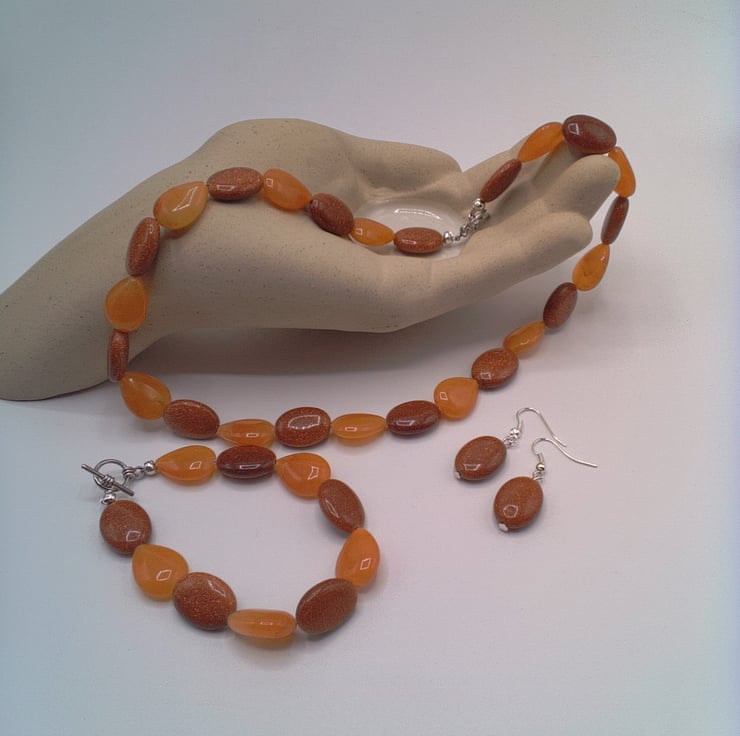 Sparkly Sunstone and Amber Glass Bead 3 Piece Jewellery Set, Sunstone Necklace, Sunstone Bracelet, Sunstone Earrings, Birthday Gift, Anniversary Gift, Gift for Her, Semi Precious Jewellery, Golden Brown Jewellery