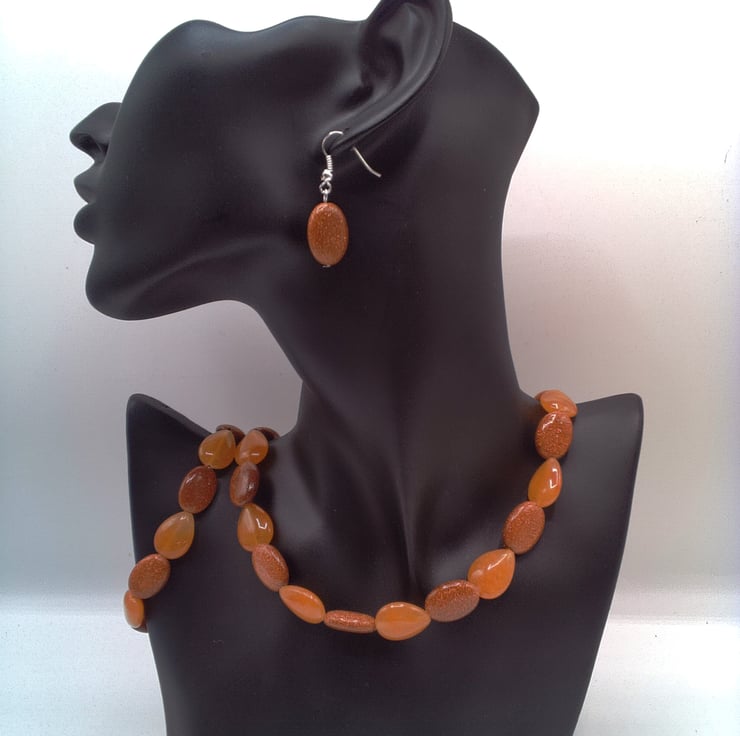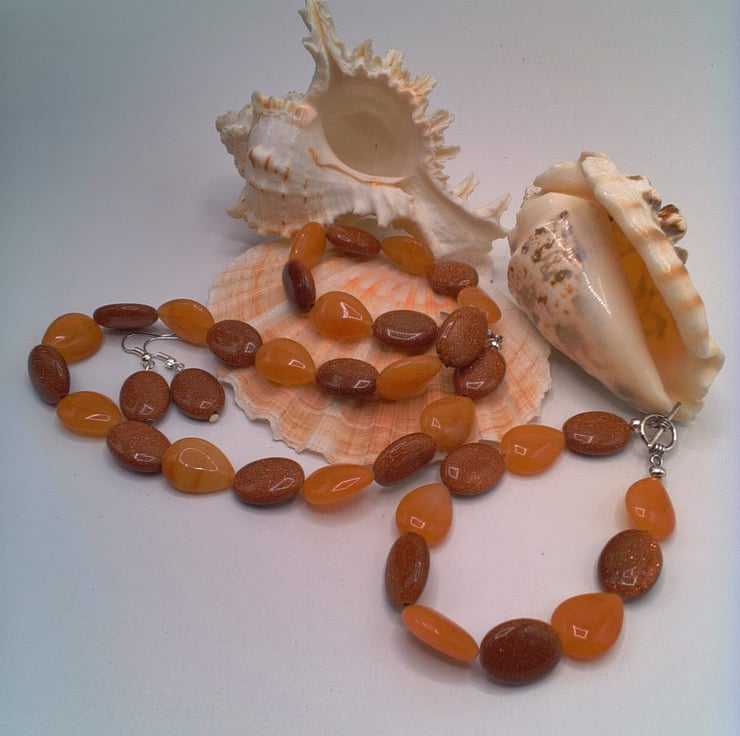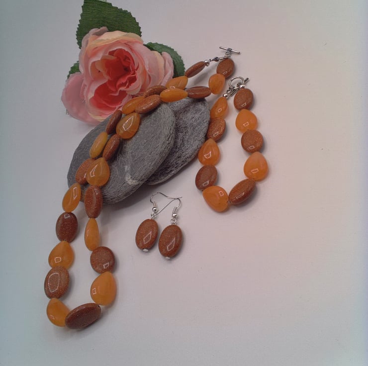 Sparkly Sunstone and Amber Glass Bead 3 Piece Jewellery Set, Sunstone Necklace, Sunstone Bracelet, Sunstone Earrings, Birthday Gift, Anniversary Gift, Gift for Her, Semi Precious Jewellery, Golden Brown Jewellery