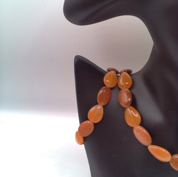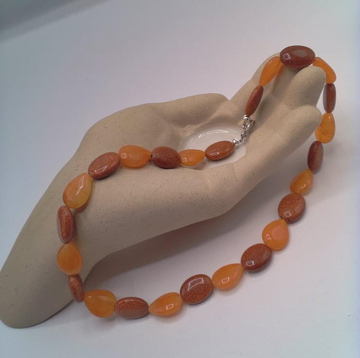 This beautiful jewellery set comprises a necklace, bracelet and pair of earrings and it is light and easy to wear. It would lift any outfit that you wear for everyday wear or a casual evening out. The necklace is made using 20 mm x 15 mm sparkly oval golden sunstone and 20 mm x 15 mm amber coloured teardrop glass beads. The earrings have one of the oval sunstone beads suspended on silver plated ear wires and both the necklace and the bracelet are fastened with a silver plated toggle clasp. The necklace is 16.5 inches (42 cm) in length, the bracelet is 6.5 inches (17 cm) long and the earrings have a drop of 0.75 inches (20 mm) from the base of the ear wires. The set will be dispatched wrapped in tissue paper in an organza bag and delivered to you via Royal Mail first class post. The set would make a lovely gift for someone special, or be a treat for yourself.