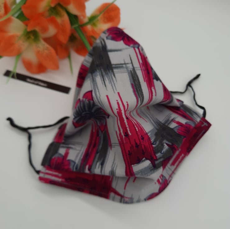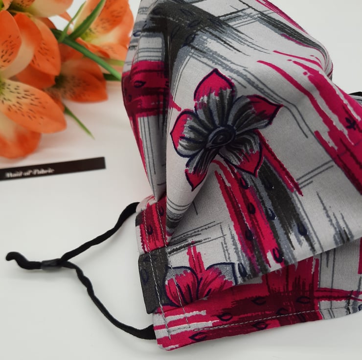 Face mask made using a pink and grey patterned cotton fabric, black adjustable elastic and a 9cm flat bendable nose wire.
