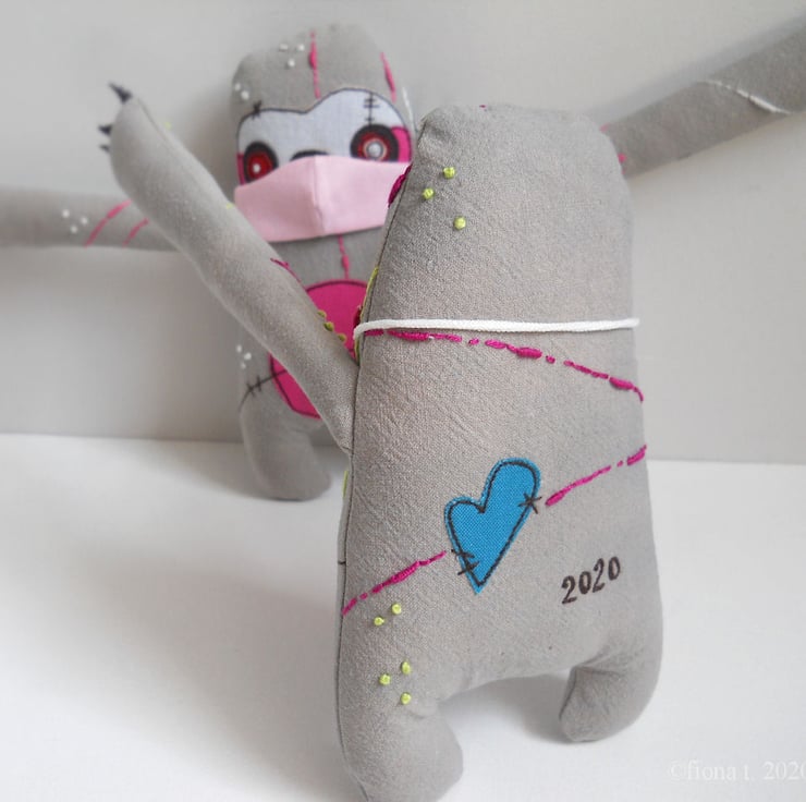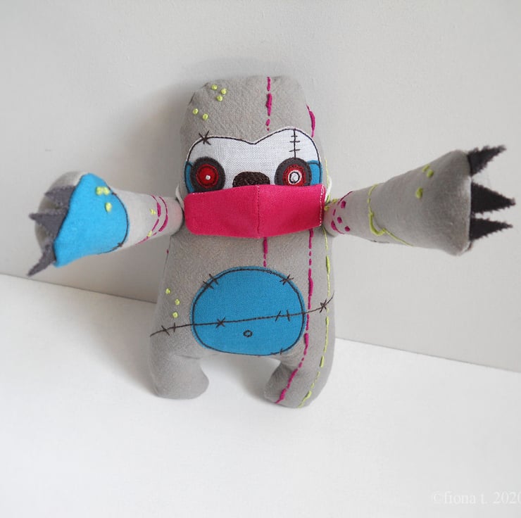 commemorative corona lockdown zombie sloth - applique, free motion & hand embroidered, size big-ish.