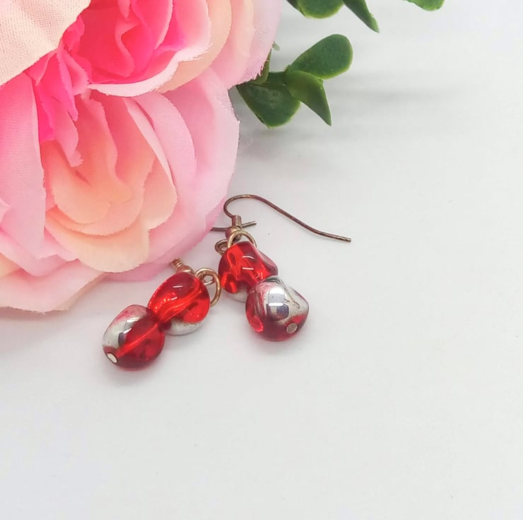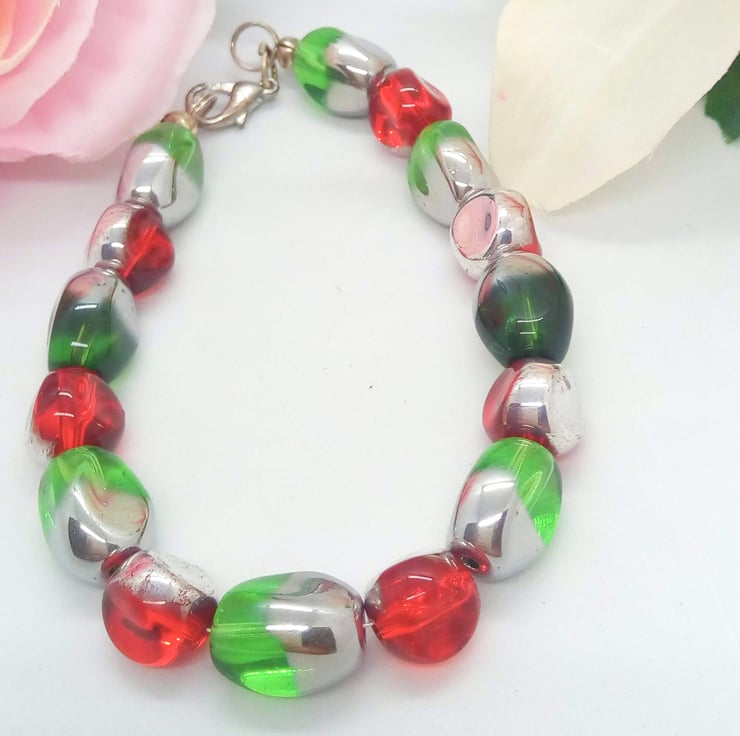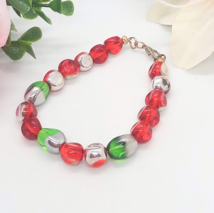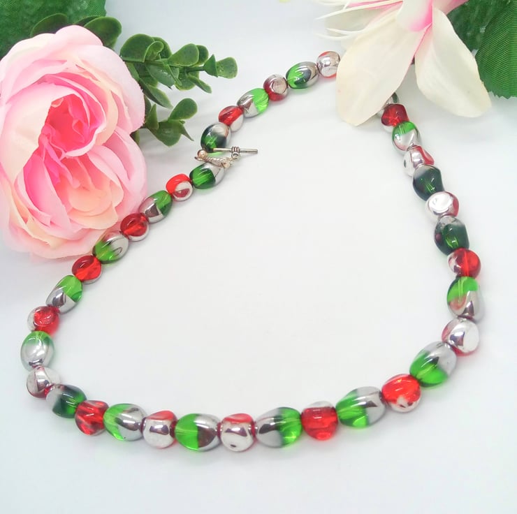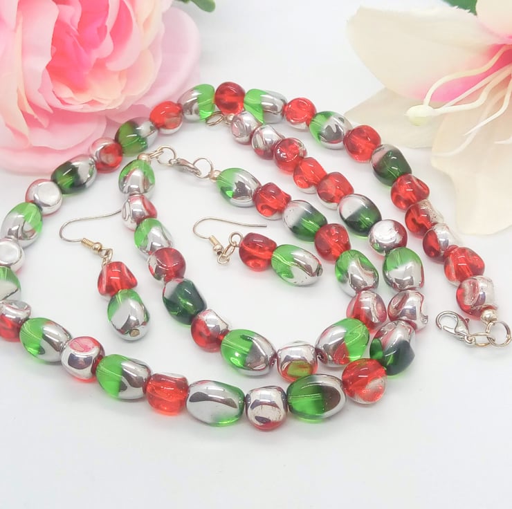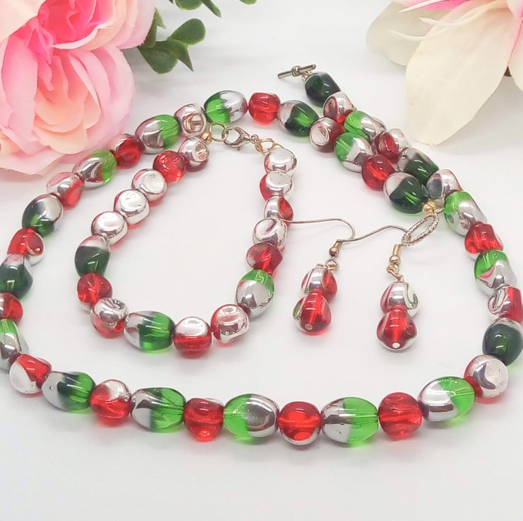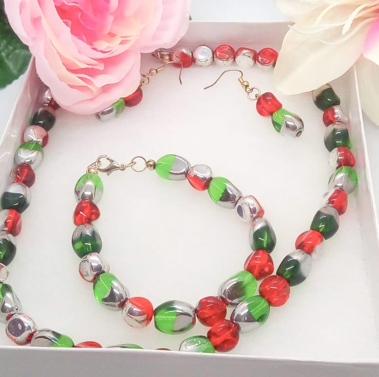 Beautiful Bundle, Red Green Electroplated Silver Glass Bead Jewellery Set, Necklace, Bracelet, Earrings, Ladies Accessories, Birthday Gift, Gift for Her, Anniversary Gift