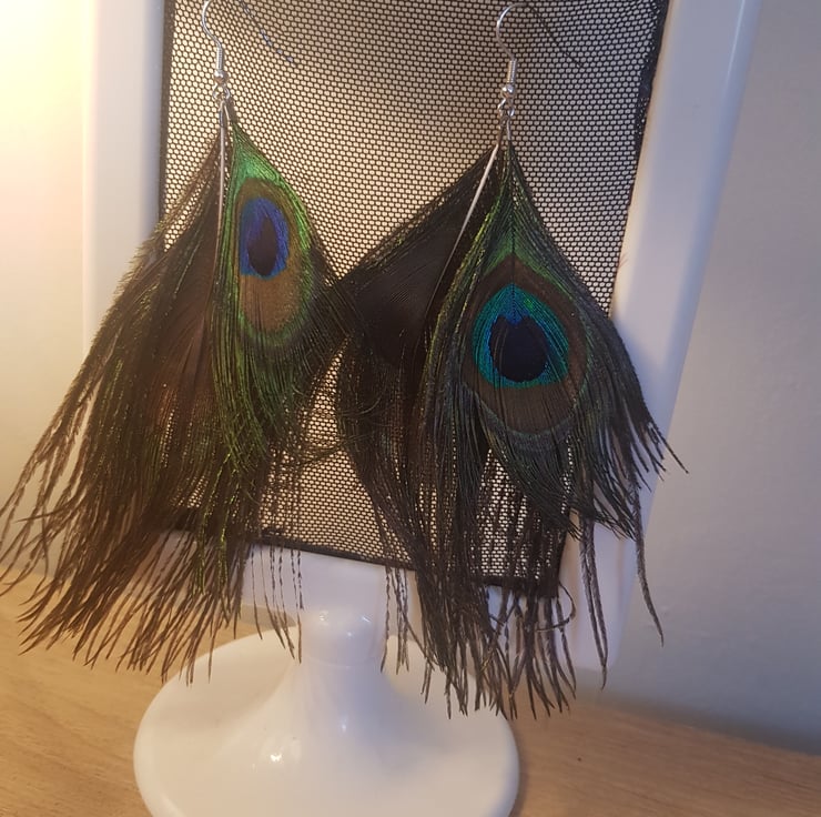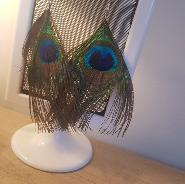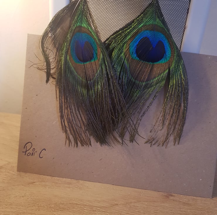 These statement dangly earing are a handmade from peacock feathers the have that beautifull shimmer to them they look amazing in the sunshine. This is (Pair C) i have listed a few pairs of these and they are slightly diffrent please check the others to ensure you defently have pair for you