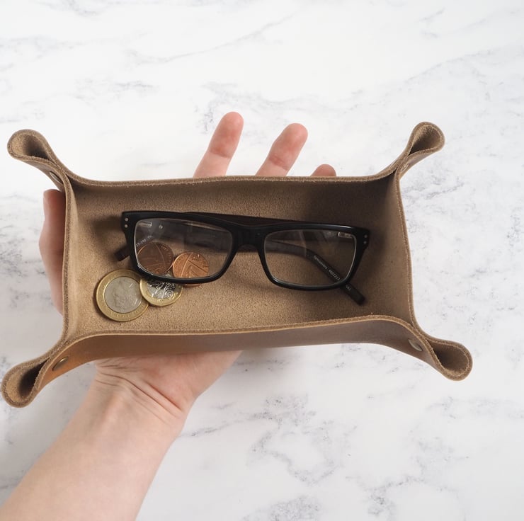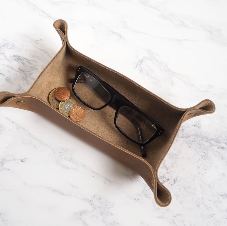 Made using a lovely tan brown Italian leather with a natural patina - meaning this leather shows markings are scratches from its previous life and will continue to age in this way as you use it, carrying your memories with you. Please note as each coin tray is made to order the appearance of your tray will differ slightly with markings and texture due to this natural characteristic of this leather.