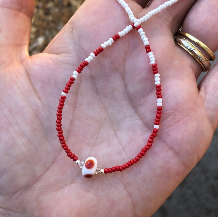 Made with small white and red dot lamp work glass bead, each side of this are 3mm Swarovski crystal beads followed by a tiny glass seed beads and sterling silver beads.