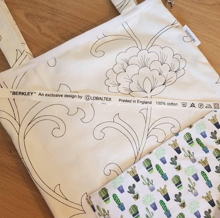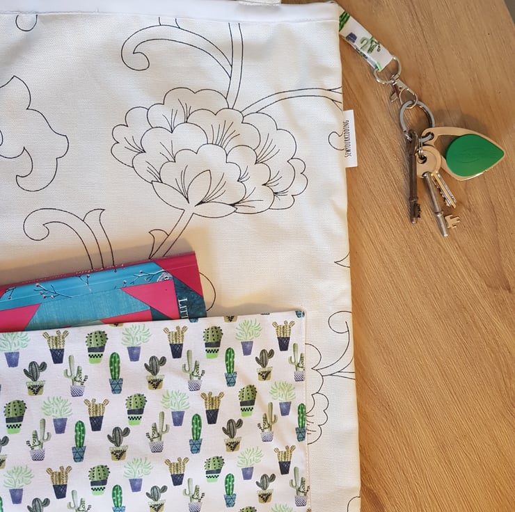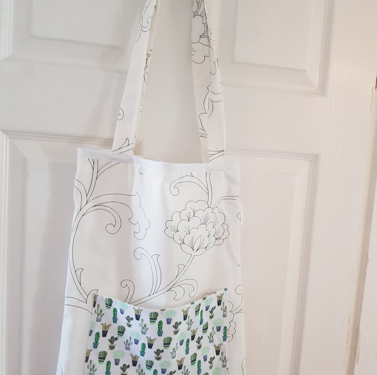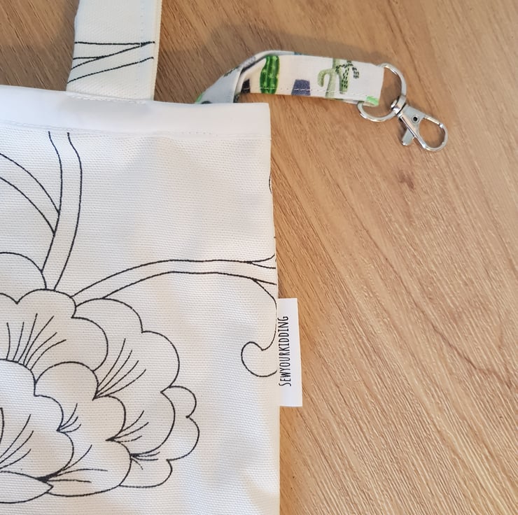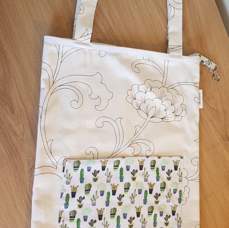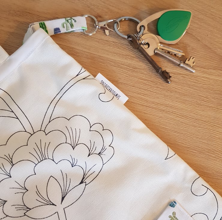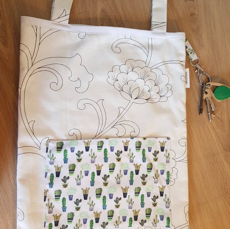 This is a handmade tote made from a durabell cotton canves fabric that is printed in england with a complamenting pocket and key clip so no more rumaging through your bag to find your keys . Its sewn together with french seams for durabillety and the top is finished with bias binding. The is a pocket on the front meshers roughly 7 by 10 inches and the bags sise is roughly 16 by 14 inches these have along enough straps that they can be trown onto your sholder even with full.