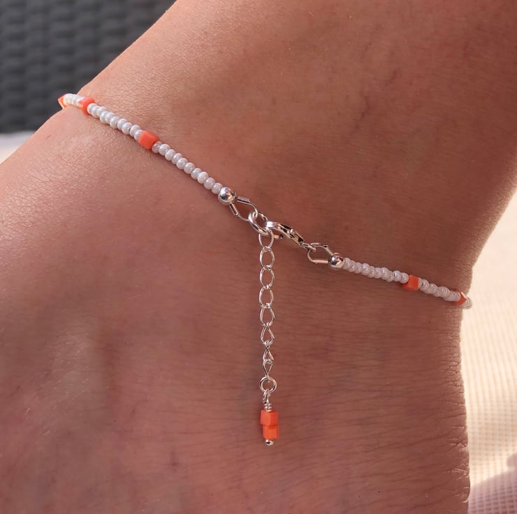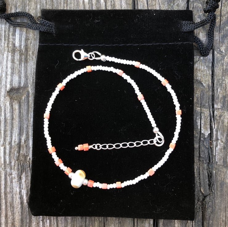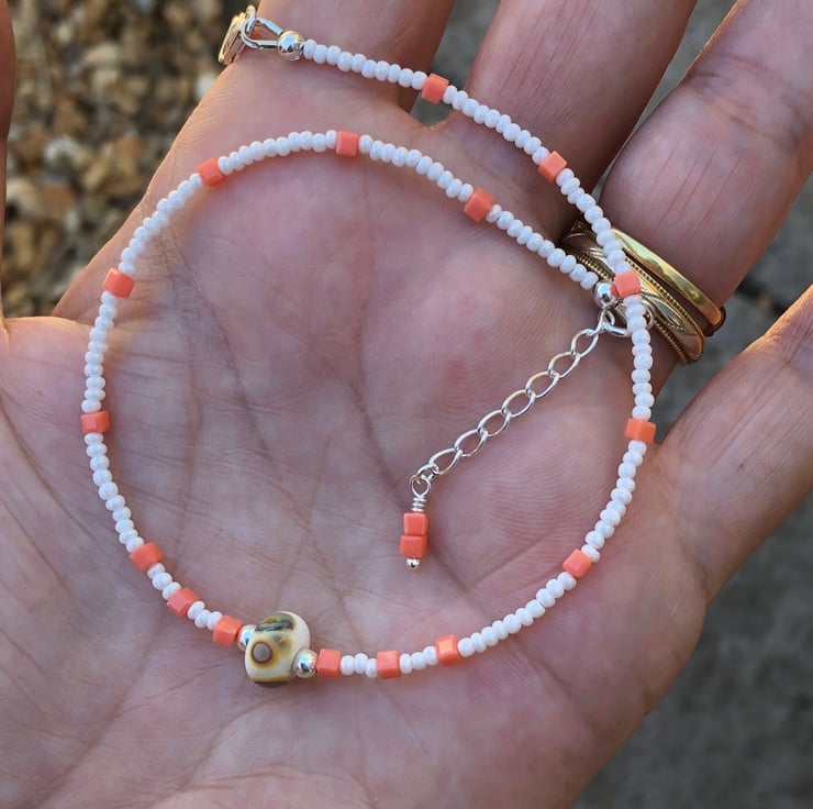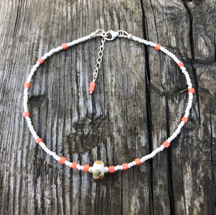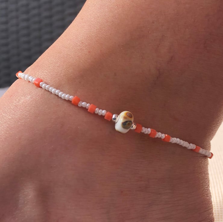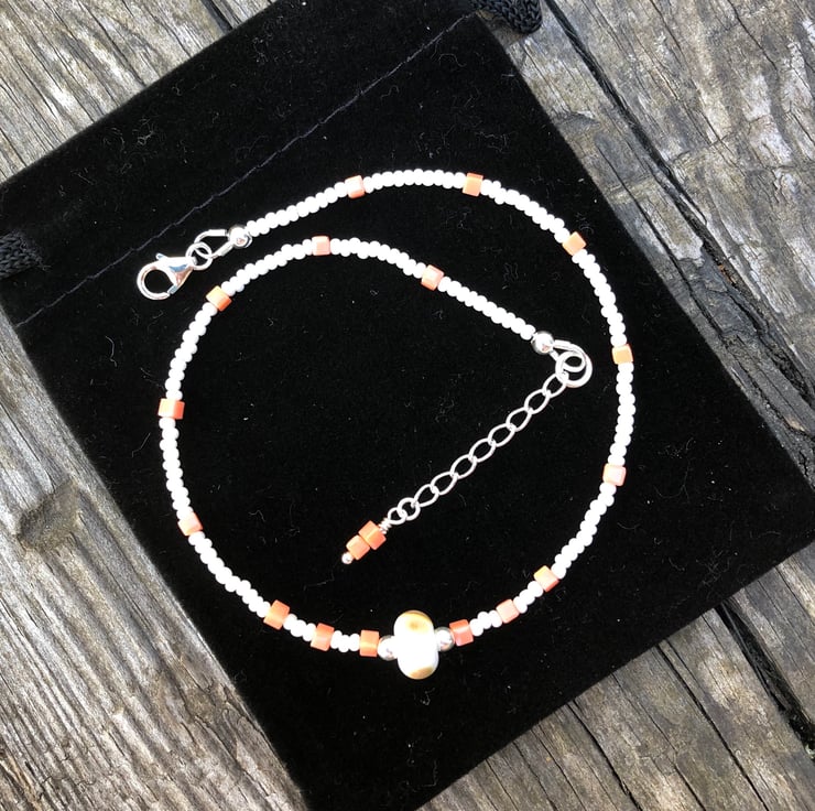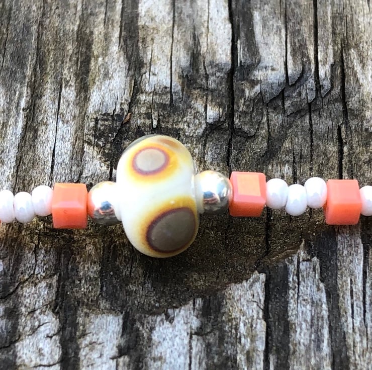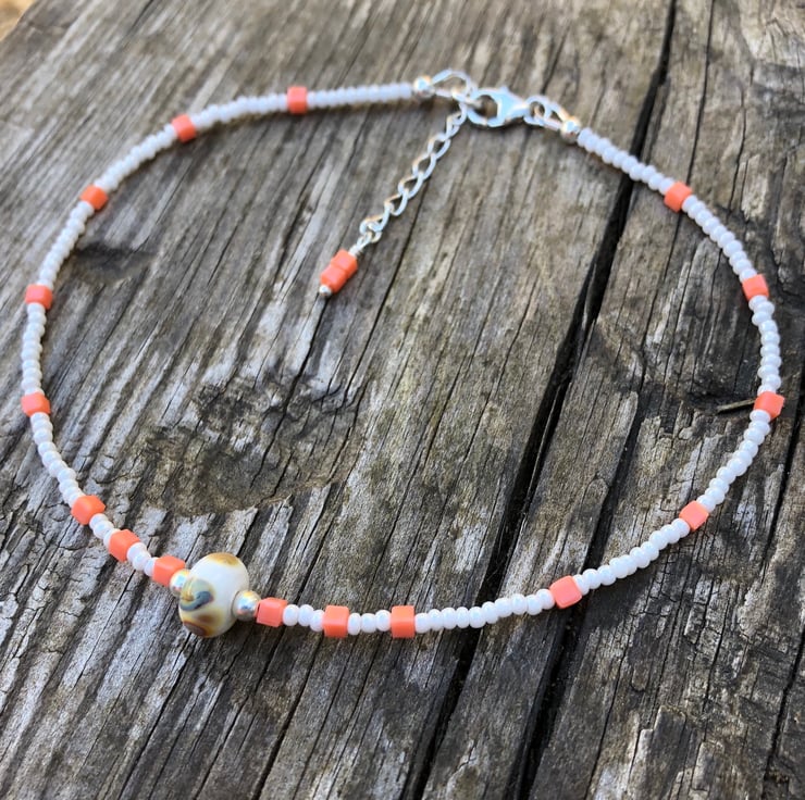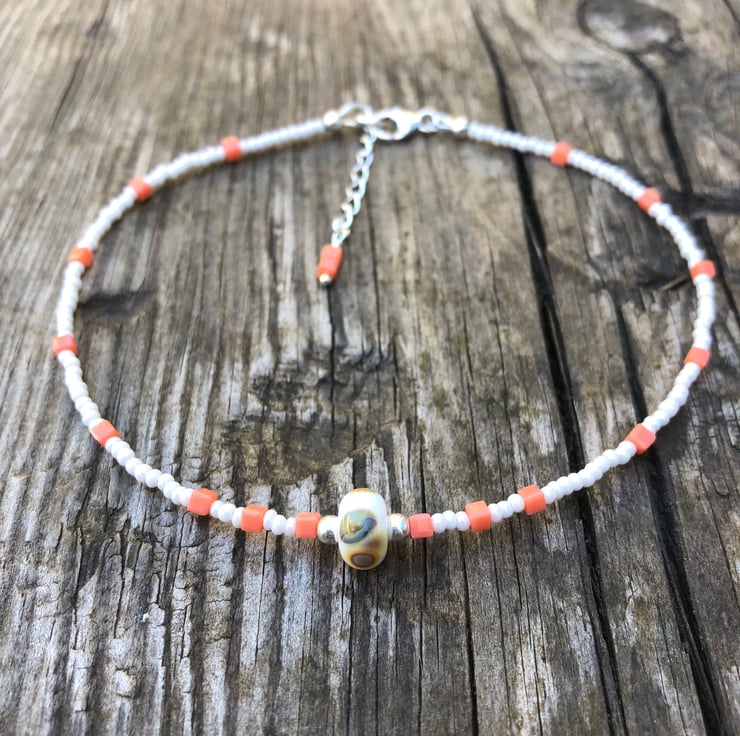 This sweet anklet has been made with a pretty white and beige lamp work glass bead which has notes of peach within it. I have teamed this with pearled white seed beads and tiny square glass peach beads.