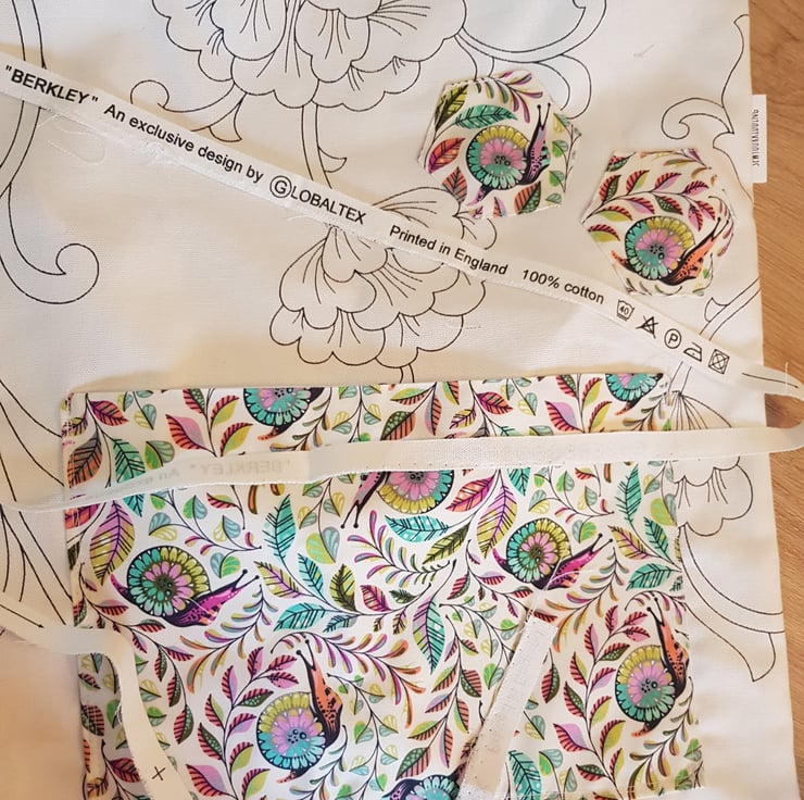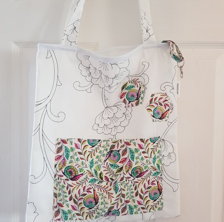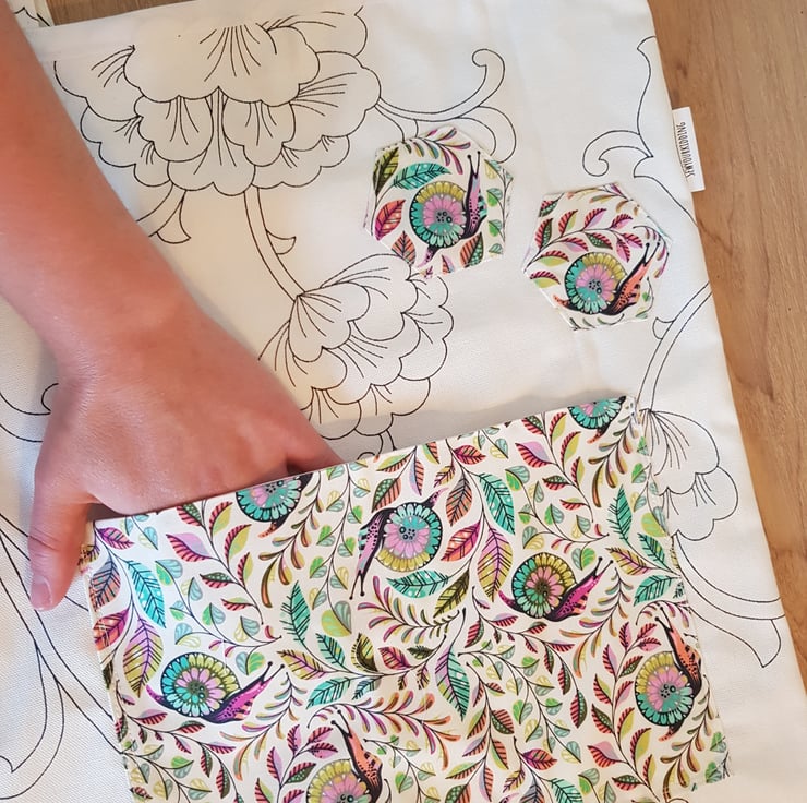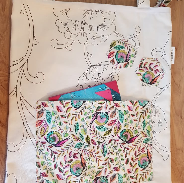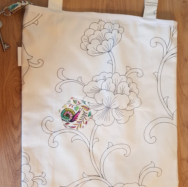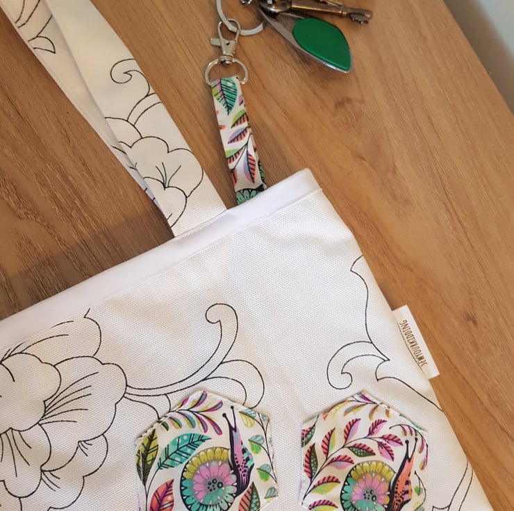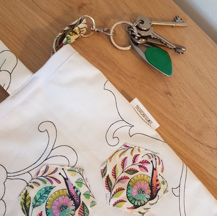 This is a handmade tote made from a durabell cotton canves fabric that is printed in england with a complamenting pocket in a realy fun snail and plant print there are 3 hexis apliqued both these and the key clip match. All of my totes have key clip witch keep your keys at the top so no more rumaging through your bag to find your keys . Its sewn together with french seams for durabillety and the top is finished with bias binding. The is a pocket on the front meshers roughly 7 by 10 inches and the bags sise is roughly 16 by 14 inches these have along enough straps that they can be trown onto your sholder even with full.