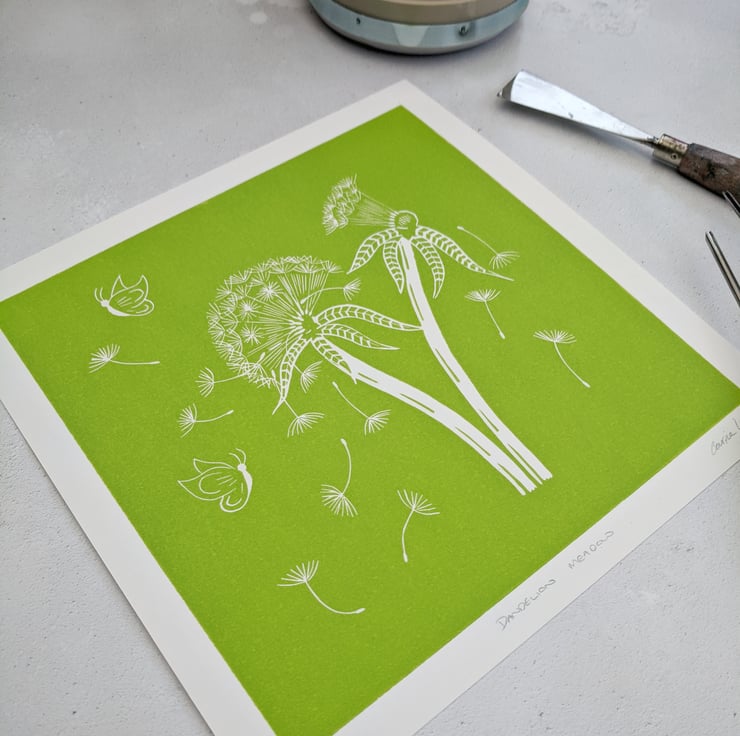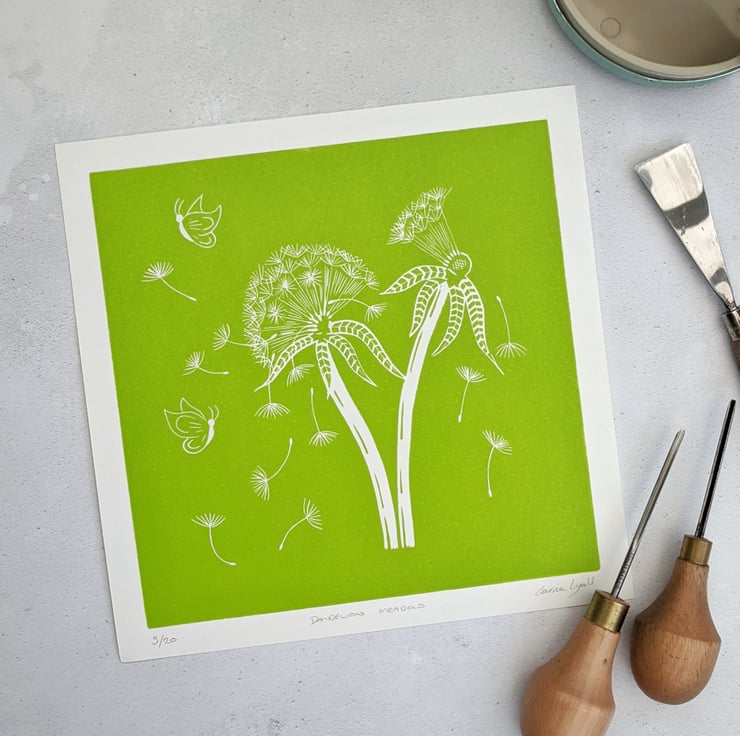 Dandelions and Moths (or butterflies) limited edition linocut print, edition of 60.