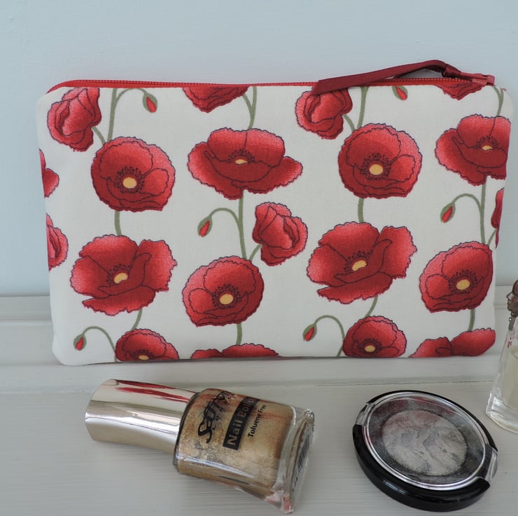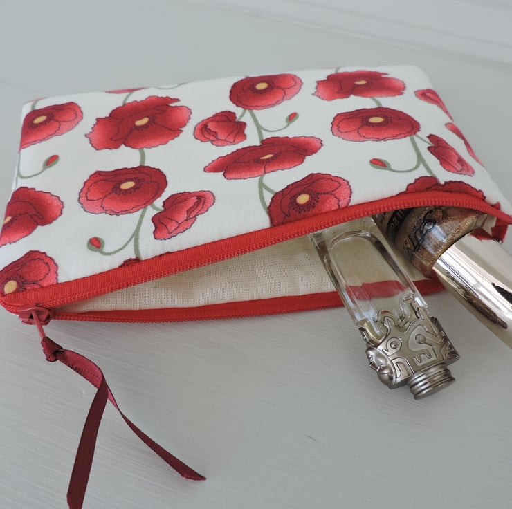This padded make up bag, zipped pouch has been made with a poppies cotton fabric , White background with red poppies and a hint of green stems. Fully lined with a cream cotton fabric. It has fusible wadding to give stability and padding. It has a red coloured zip with a burgundy ribbon pull.. The bag measures 7ins (18cm) by 4.5ins (12cm).