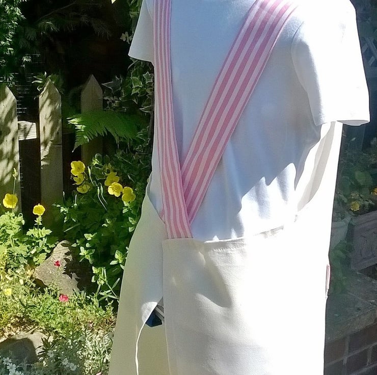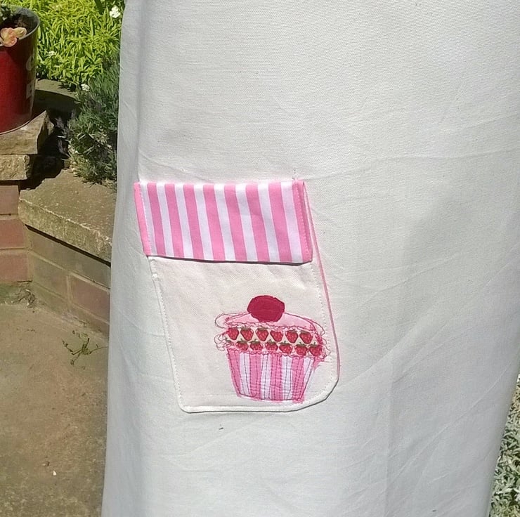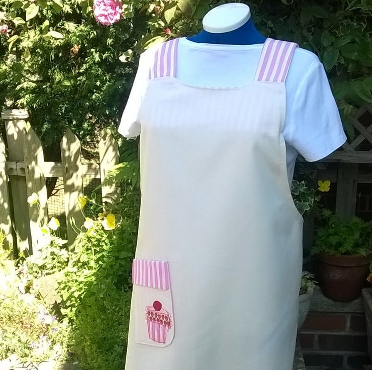 This listing is for a Japanese cross backed apron in a 100% cotton fabric, it has a candy pink striped detail on the straps and a applique cupcake design on the pocket. All edges have been overlocked for a professional finish.