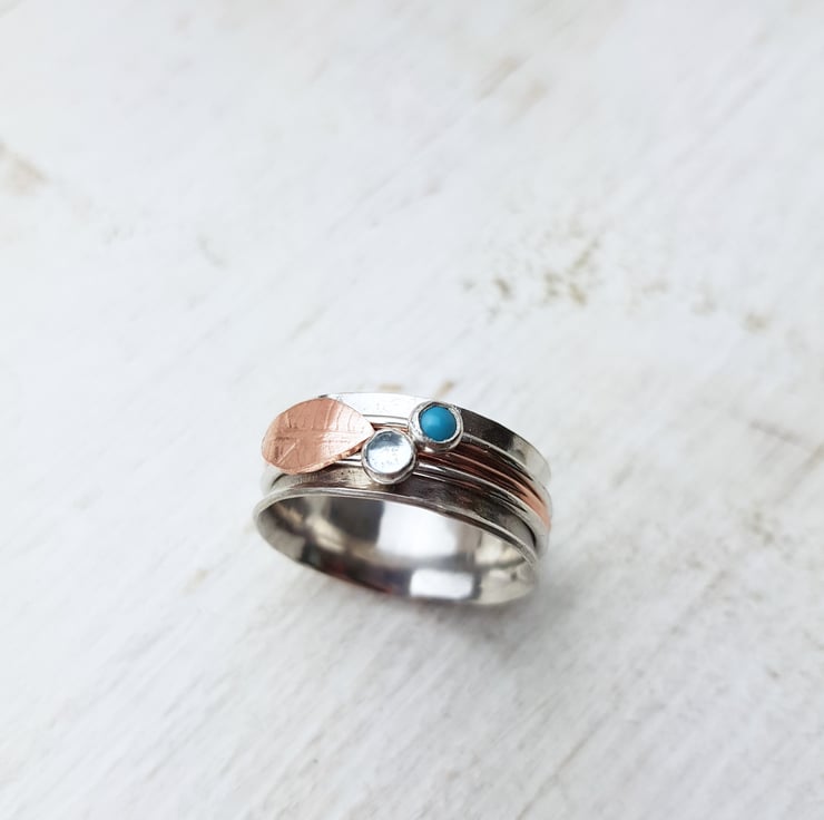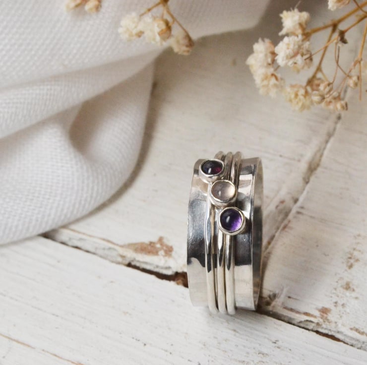 This handcrafted, sterling silver ring is 8mm wide and holds three little spinner bands which could be plain silver, hold a little ball, or shape or 3mm gemstone cabochons.