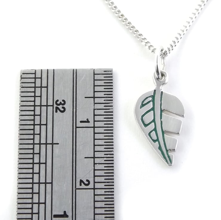 This small leaf pendant has been lovingly crafted by hand in Shropshire. It is made from recycled sterling silver sheet and is etched before being cut by hand, the edges are then smoothed using files and emery paper before it's carefully given its shape using a punch and hammer. A 5mm oval jump ring is then attached. A green resin based enamel is added to the etched areas and the piece is then polished before being attached to a chain.