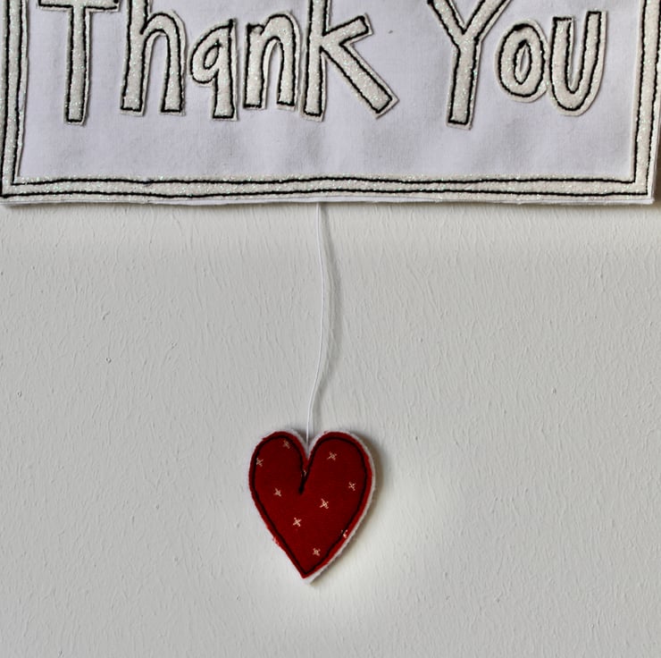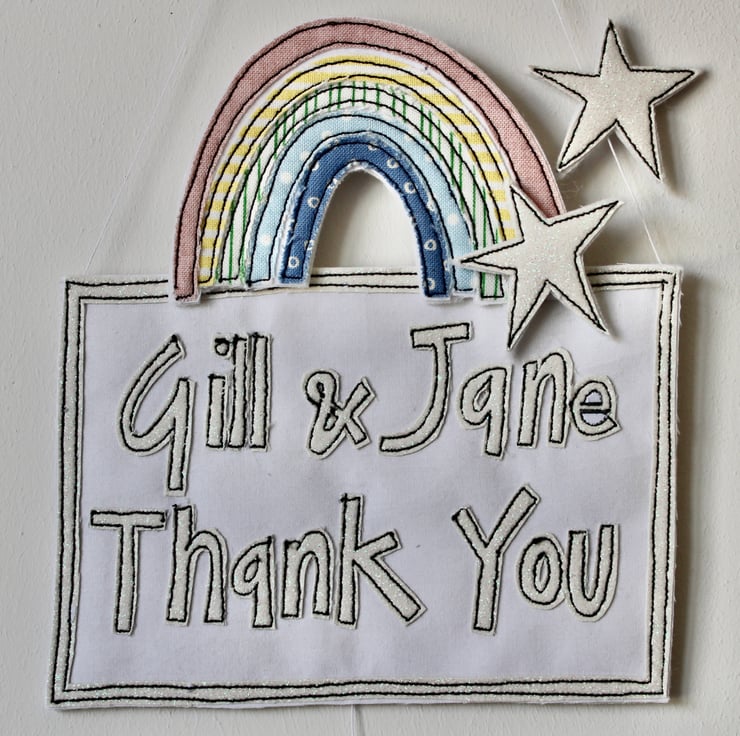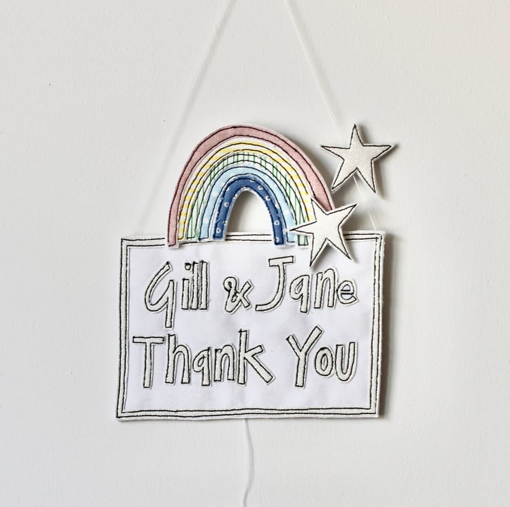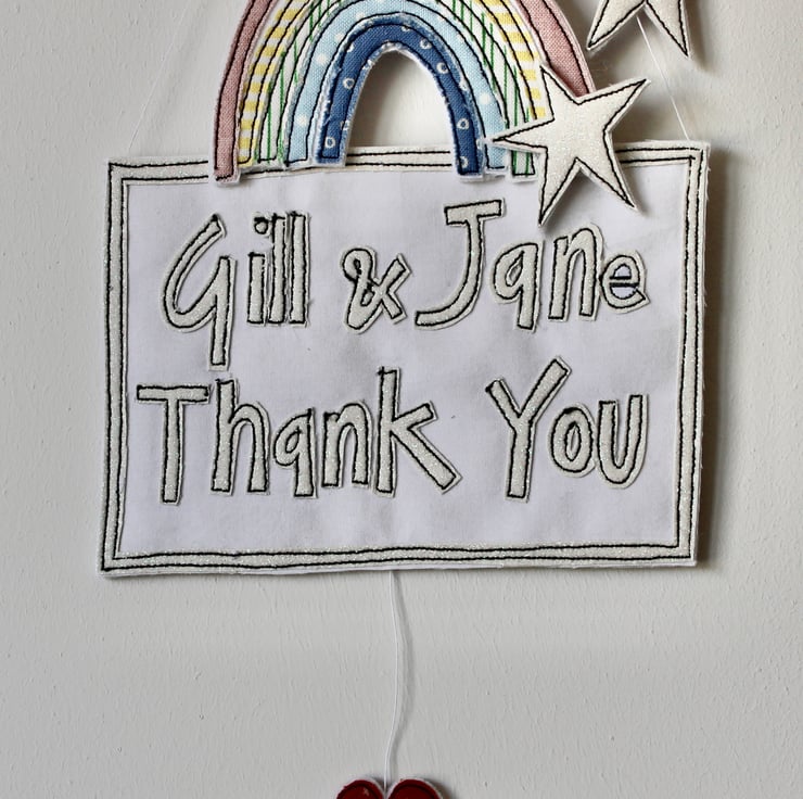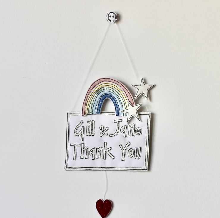 A handmade rainbow with two glittery stars, a glittery big thank you and a suspended heart.
