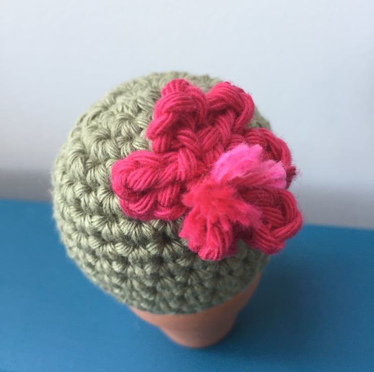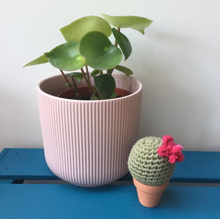 This cute mini cactus, in bloom with a hot pink flower, is crocheted in khaki green cotton yarn and glued into place in its own mini terracotta pot. It will brighten up any windowsill, office desk or bedside table! It could also be used as a cute pincushion for those with crafty fingers. It is perfect as an end of term gift for a special teacher.
