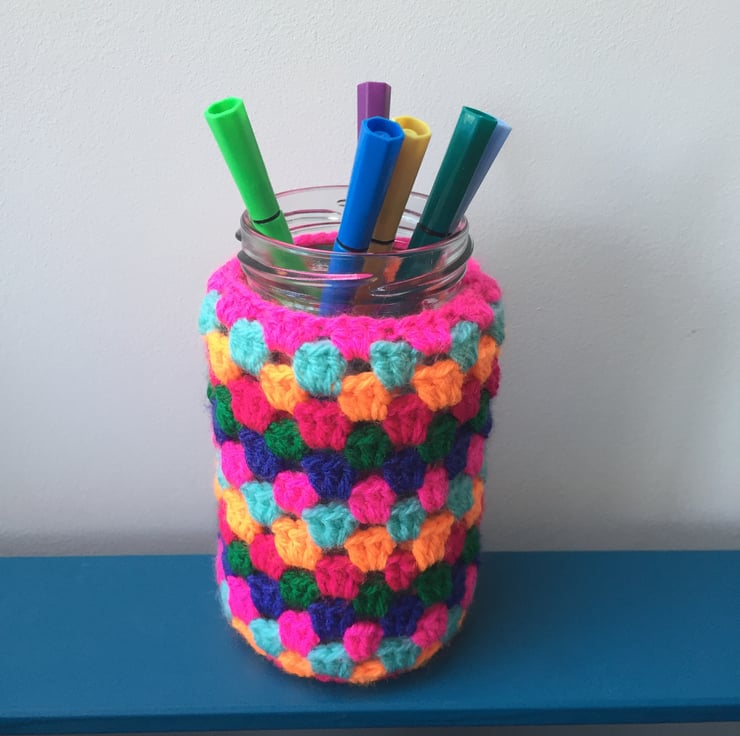 Bring a splash of colour to your home with a bright and cheerful crochet jam jar vase.
