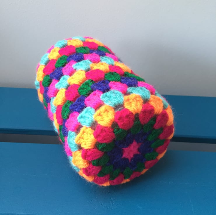The hexagonal jar measures approx 13cm high and 6cm diameter. It's cosy is crocheted in stripes of premium acrylic yarn and will protect any surfaces from scratches.