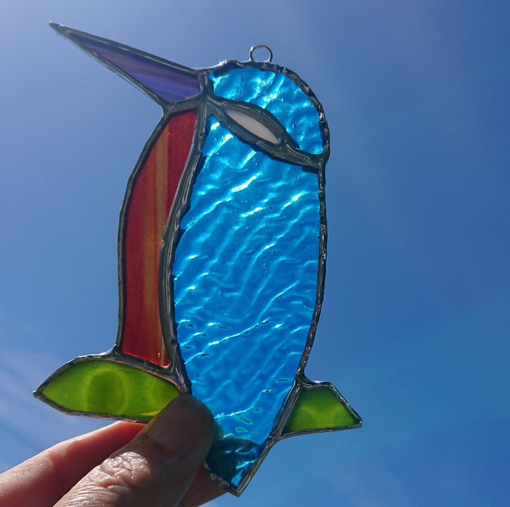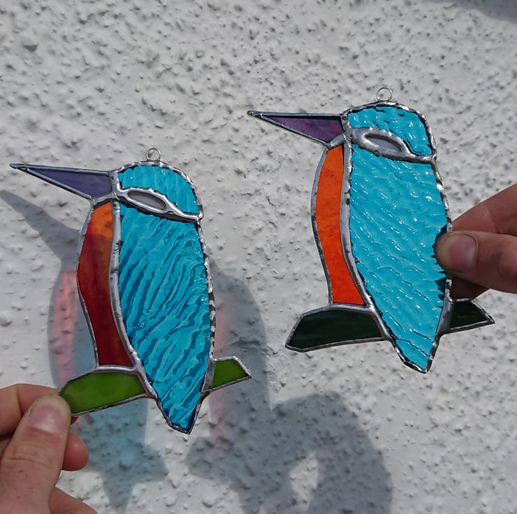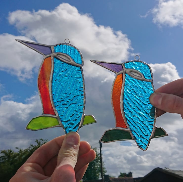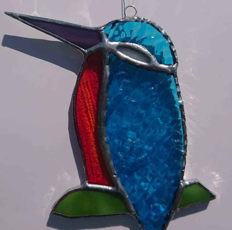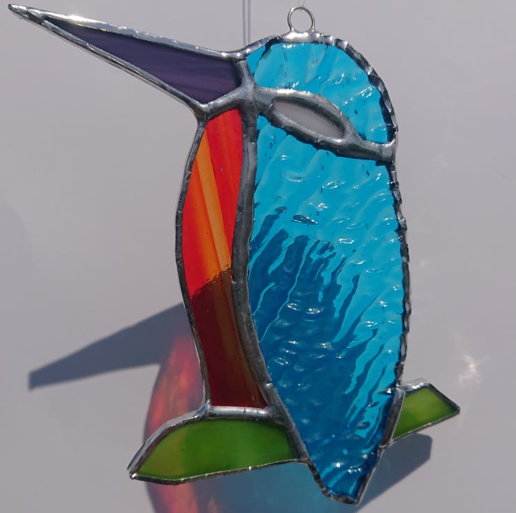 The main colour is a heavily textured turquoise glass, contrasted with bright orange for the kingfisher's breast feathers. Purple, white and green finish this striking piece.
