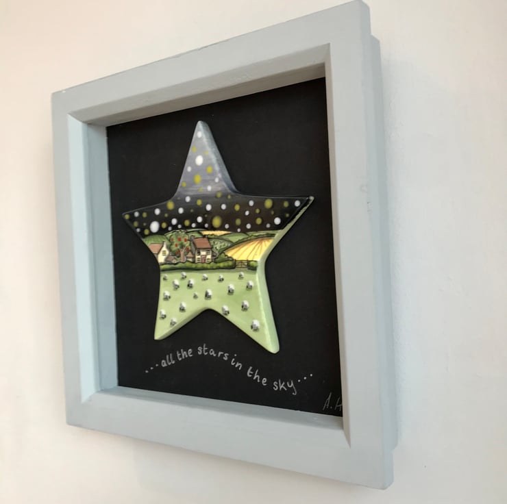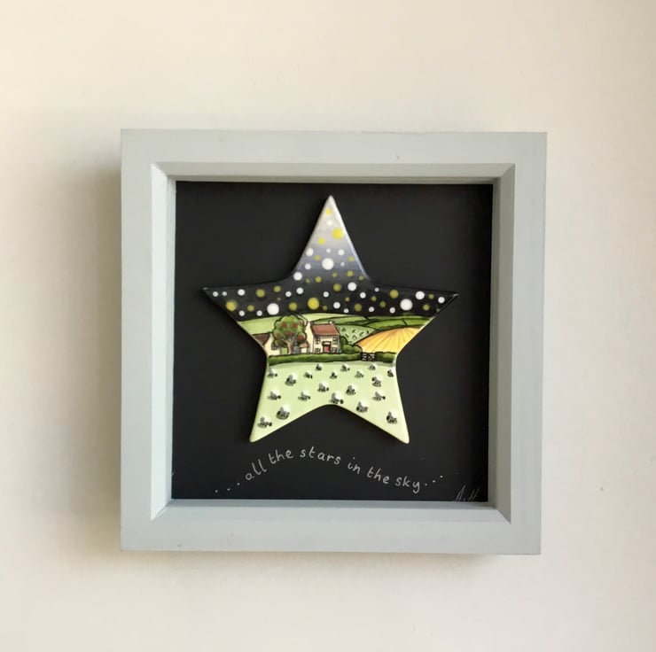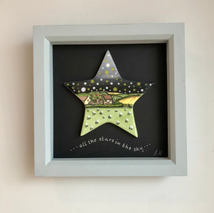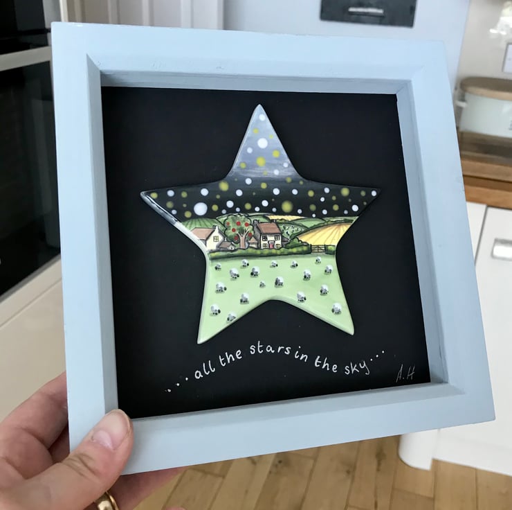 This is a unique painting of a starry night country scene. Hand painted in bright glazes on an earthenware star shaped tile and kiln fired. With a little quote written in silver “all the stars in the sky” finishes off this cute picture. Mounted on black card and box framed.
