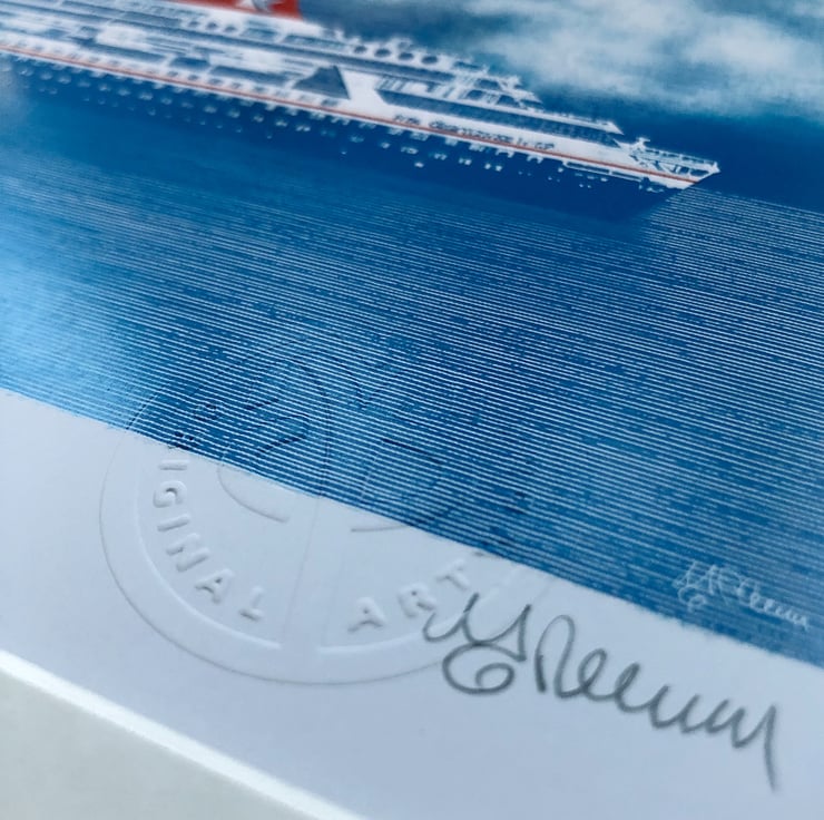 I’ve travelled with Fred.Olsen many times and I love the ship’s timeless aspect and sense of tradition. This linotype style of illustration uses a multitude of individually created horizontal lines representing an ageless portrayal to this great liner and captures the ship's smooth and calm navigation of the oceans. Completed throughout in Fred.Olsen’s distinctive and vibrant corporate blue with the added touch of pillar box red on the key line and funnel.