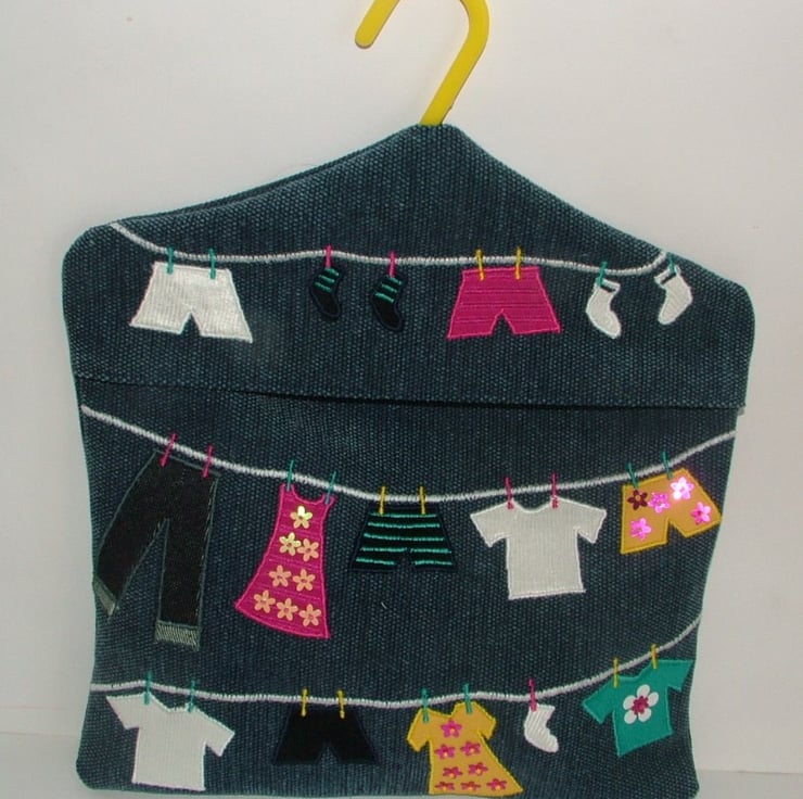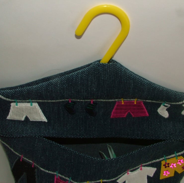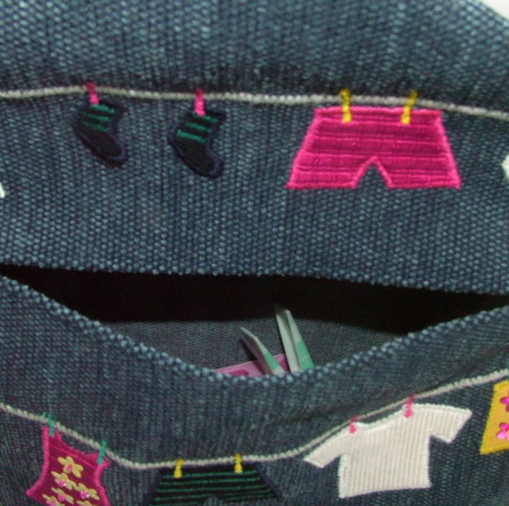 It has three zig-zag stitch washing lines, with colourful zig-zag pegs, featuring textural washing including, socks, pants, t-shirts, jeans, and dresses. Four of the items have also been embellished with flower sequins and beads to give an extra sparkle.